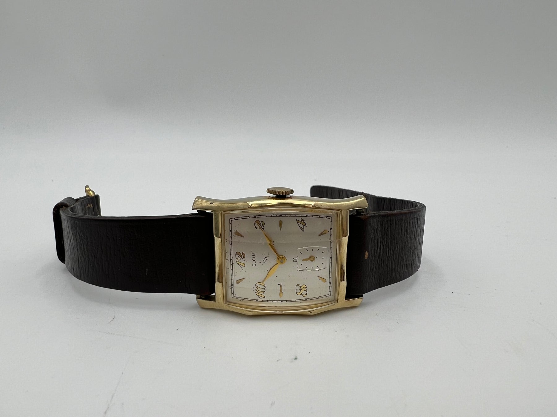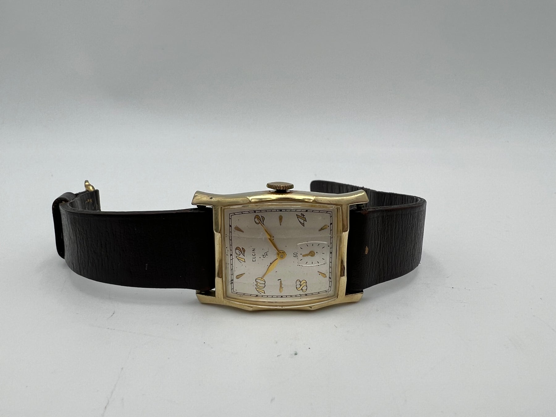 This Elgin wristwatch is a timeless classic suitable for both dress/formal and casual occasions. The watch is manually wound and features a small second, making it a unique and special piece. The case is made of 10k gold-filled material and the band is made of leather. The dial color is white, adding a touch of elegance to this exquisite timepiece. This watch is perfect for men and will make a great addition to any collection.