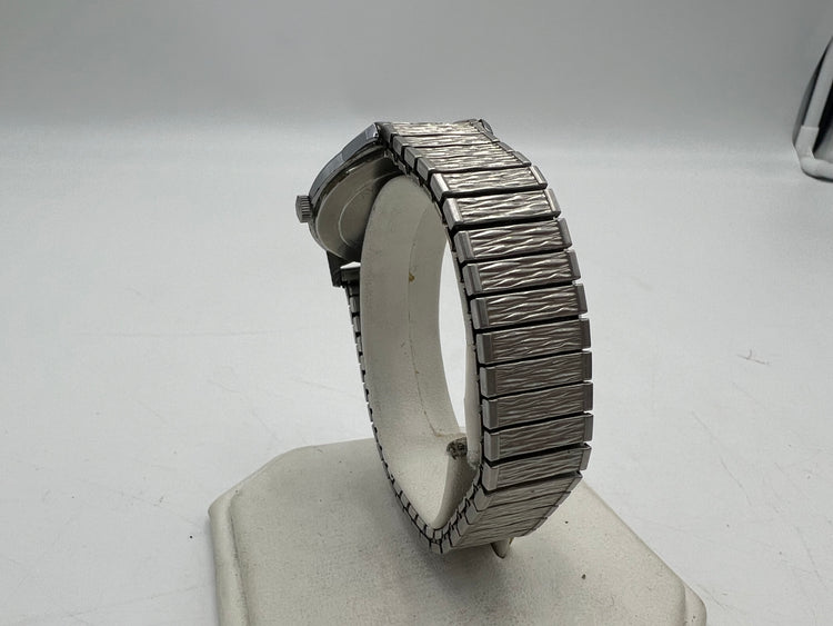 32mm dial diameter with a band width of 16mm. The band is a stainless steel stretch band. The watch weighs 52.6 grams. There are some scratches on the crystal.
