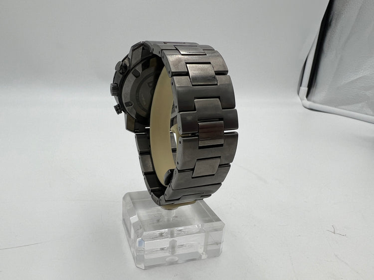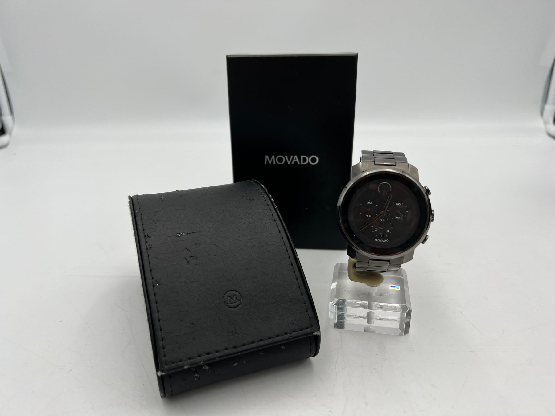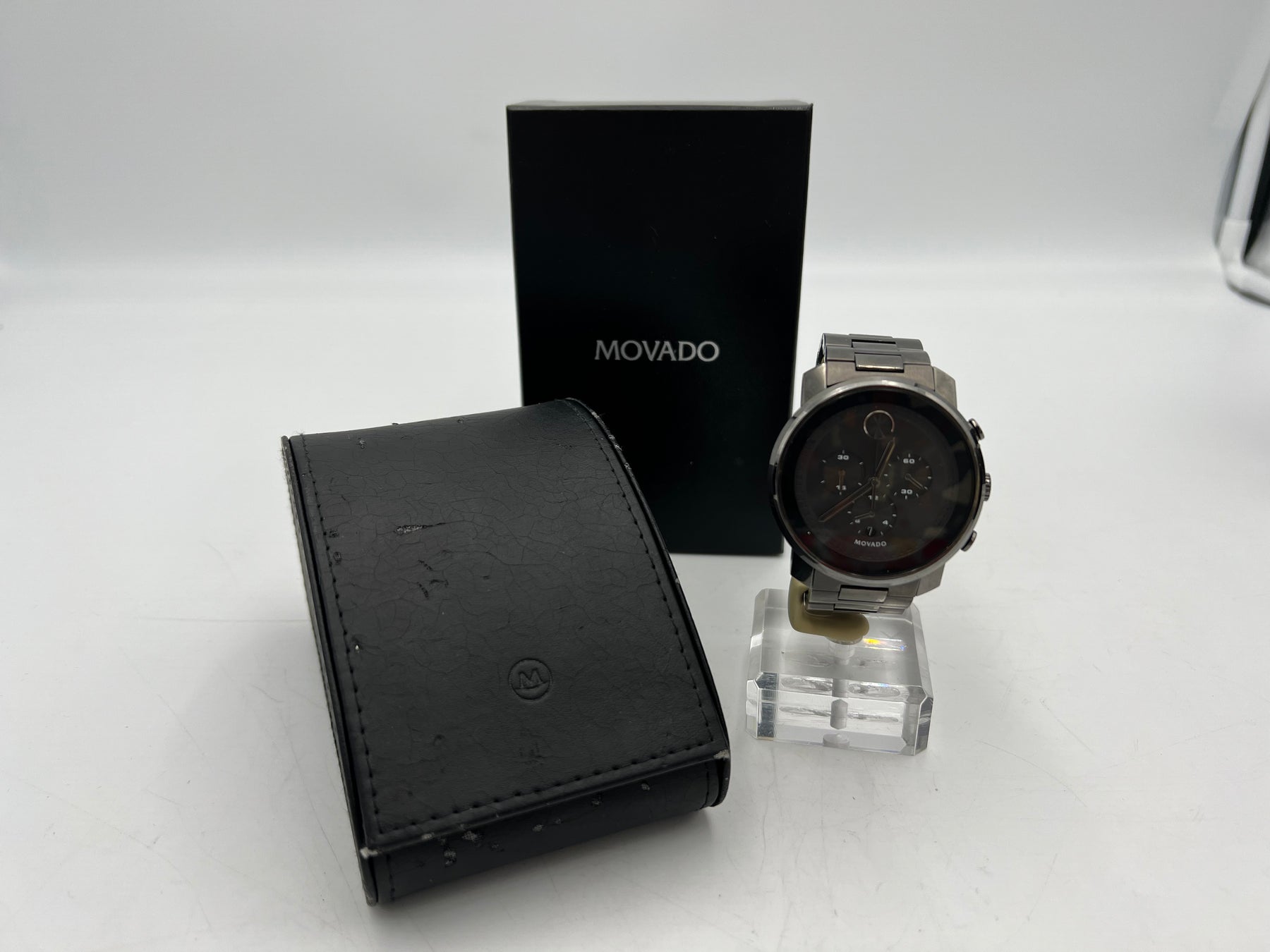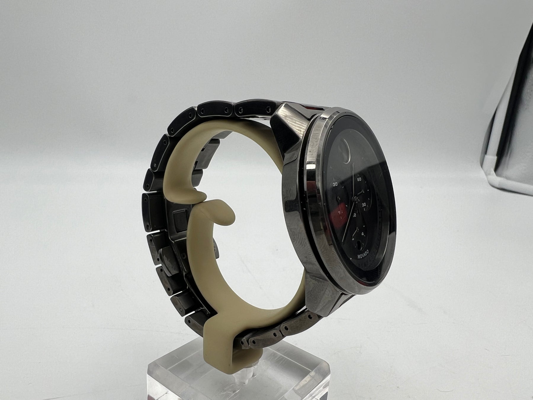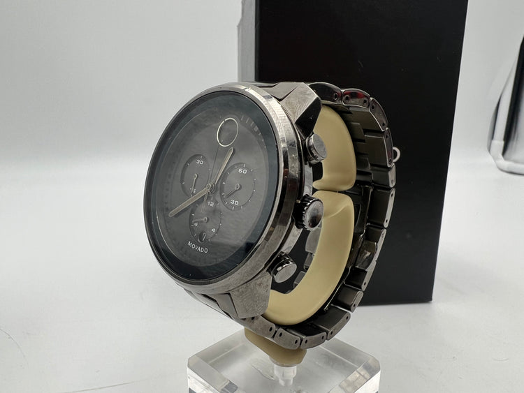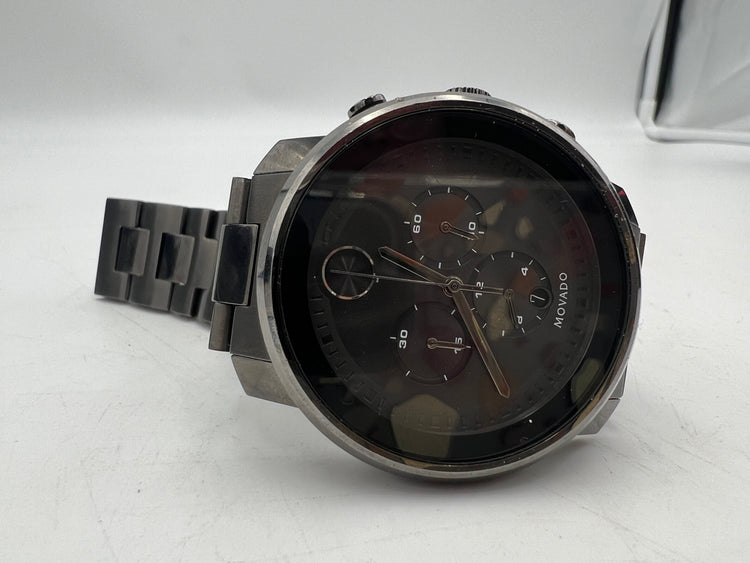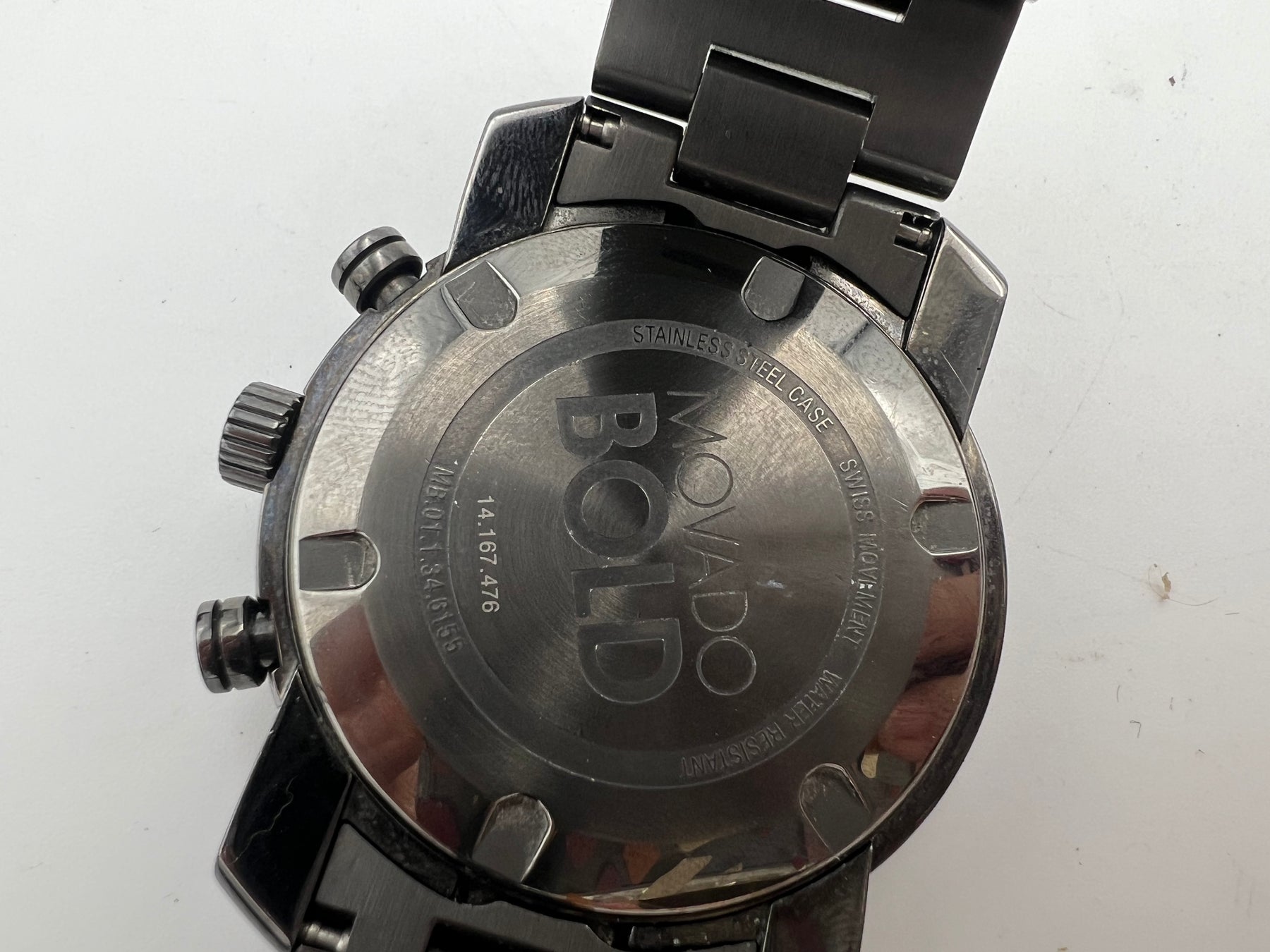 Movado Bold wrist watch. Crystal is in good shape; no apparent scratches. Swiss quartz movement. Reference number is MB.01.1.34.6155. Date complication as well as a chronograph function. Dial diameter is 43mm, band width is 21mm. 175.1 grams. Comes with box.