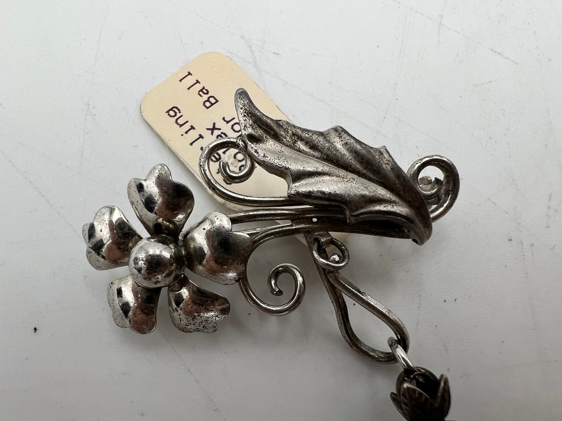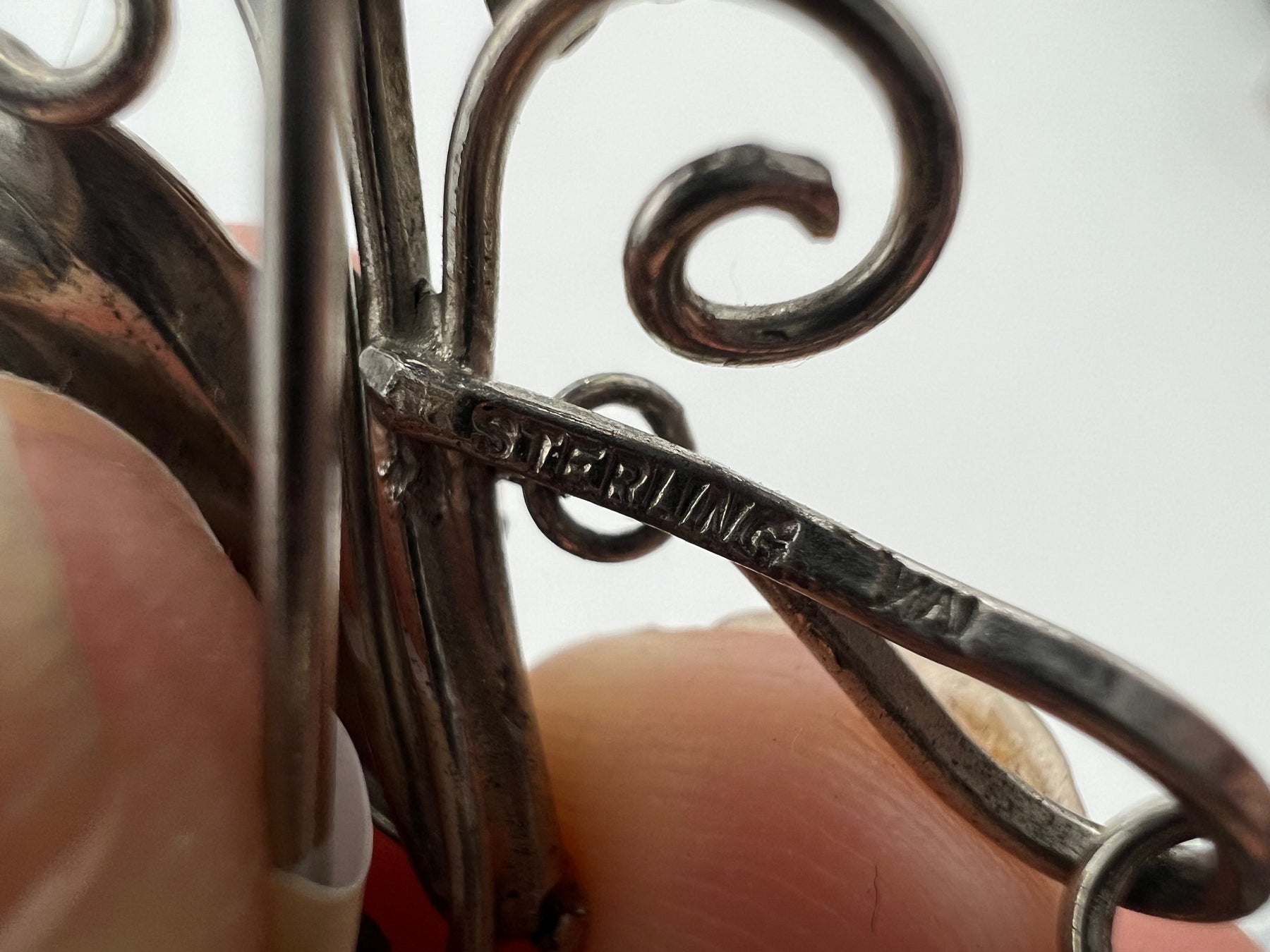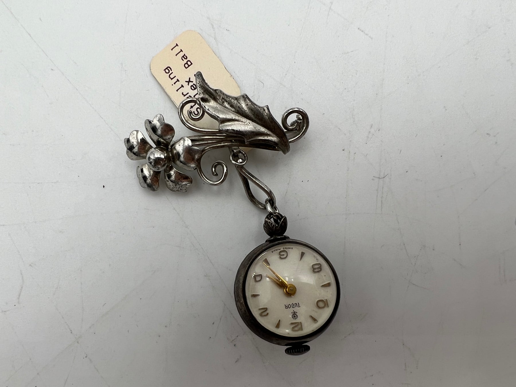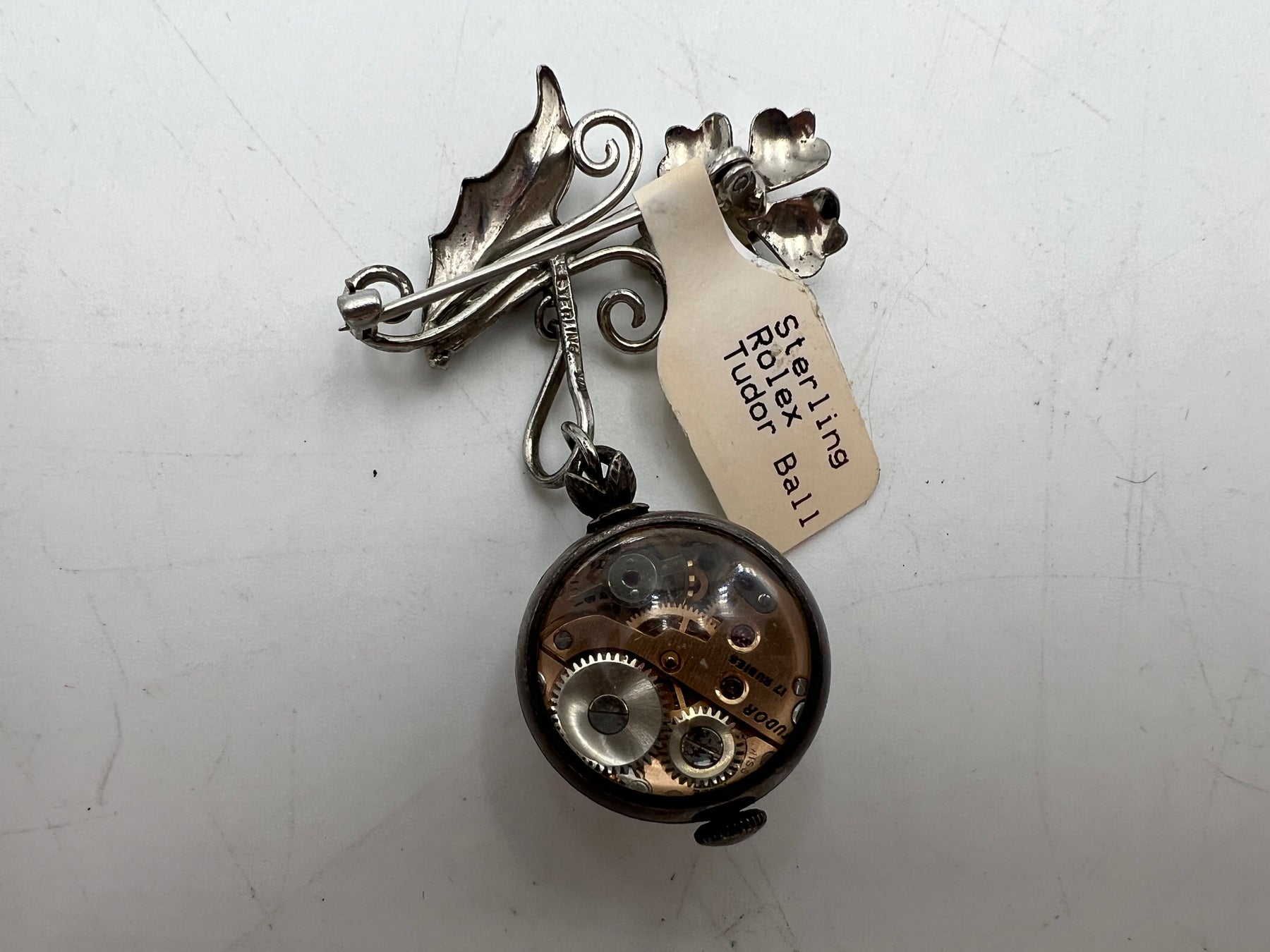 This little brooch and watch is sterling silver, as indicated on the pin. It has a weight of 16 grams. The dial diameter of the watch is 20mm and the length of the entire thing is 50mm and the width is approximately 40mm.