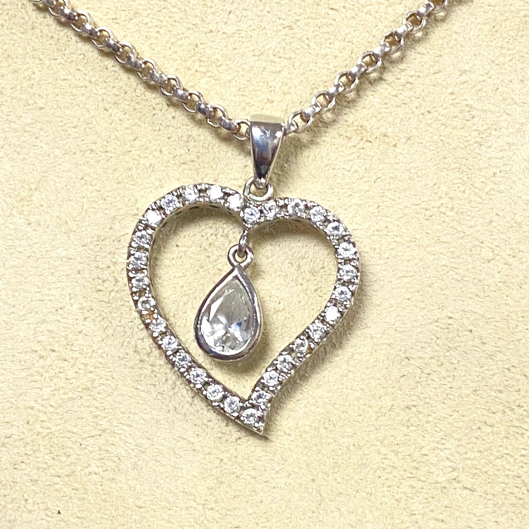 * Sterling Silver detachable Heart Pendant. White/Colorless CZ Stones. Main stone teardrop shape is 7mm x 4mm. Multiple Round CZ stones 1mm in diameter each. Pendant 27mm x 20mm x 2mm deep.