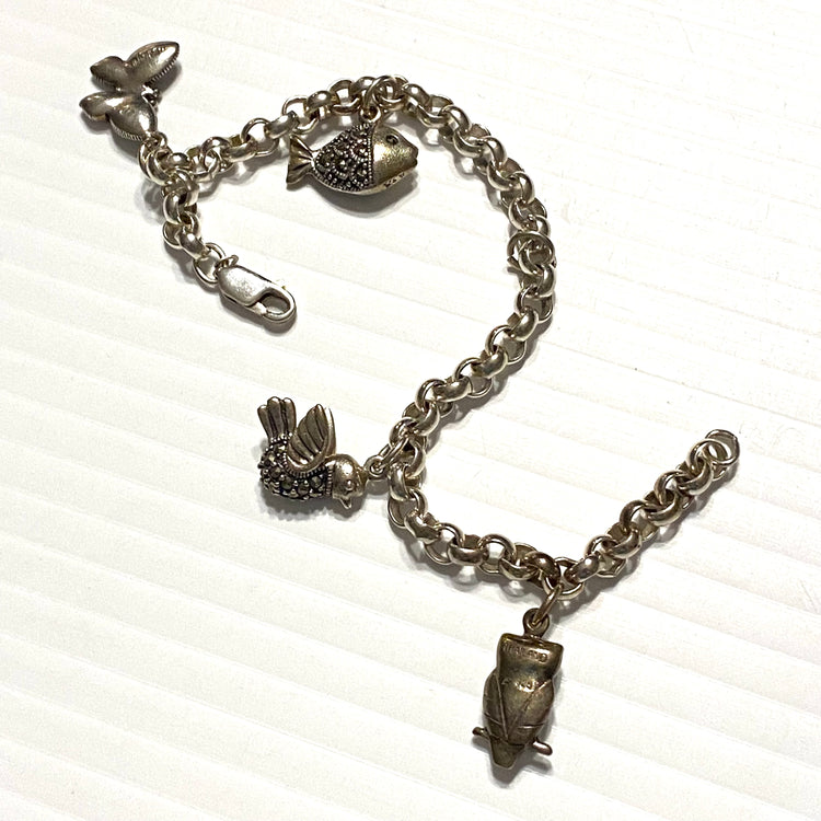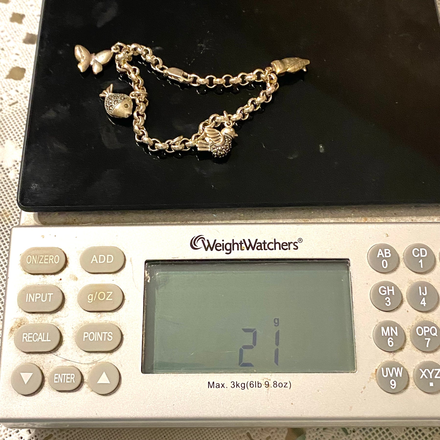 u580 Vintage 925 Sterling Silver Round Link Chain Bracelet 7" Long & 4 Charms