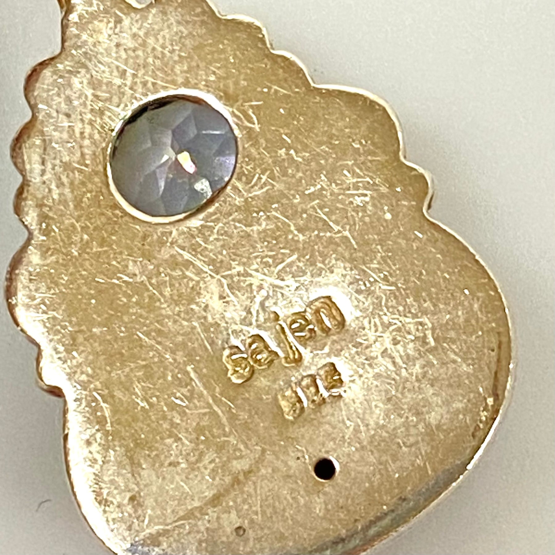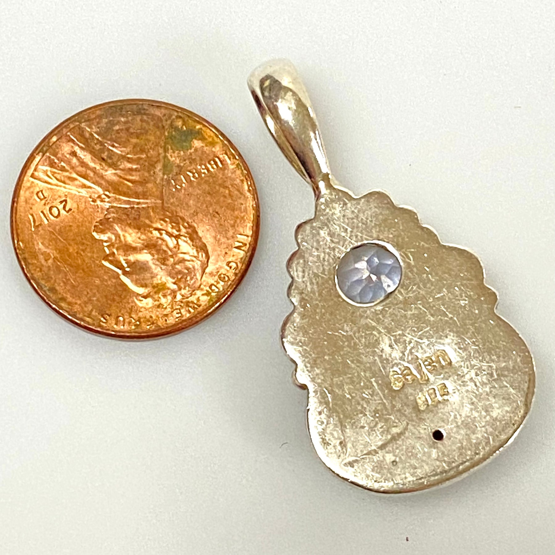 - Floral pendant with center oval Blue Sparkling Stone (10mm x 14mm) and round light blue stone 1mm in diameter.