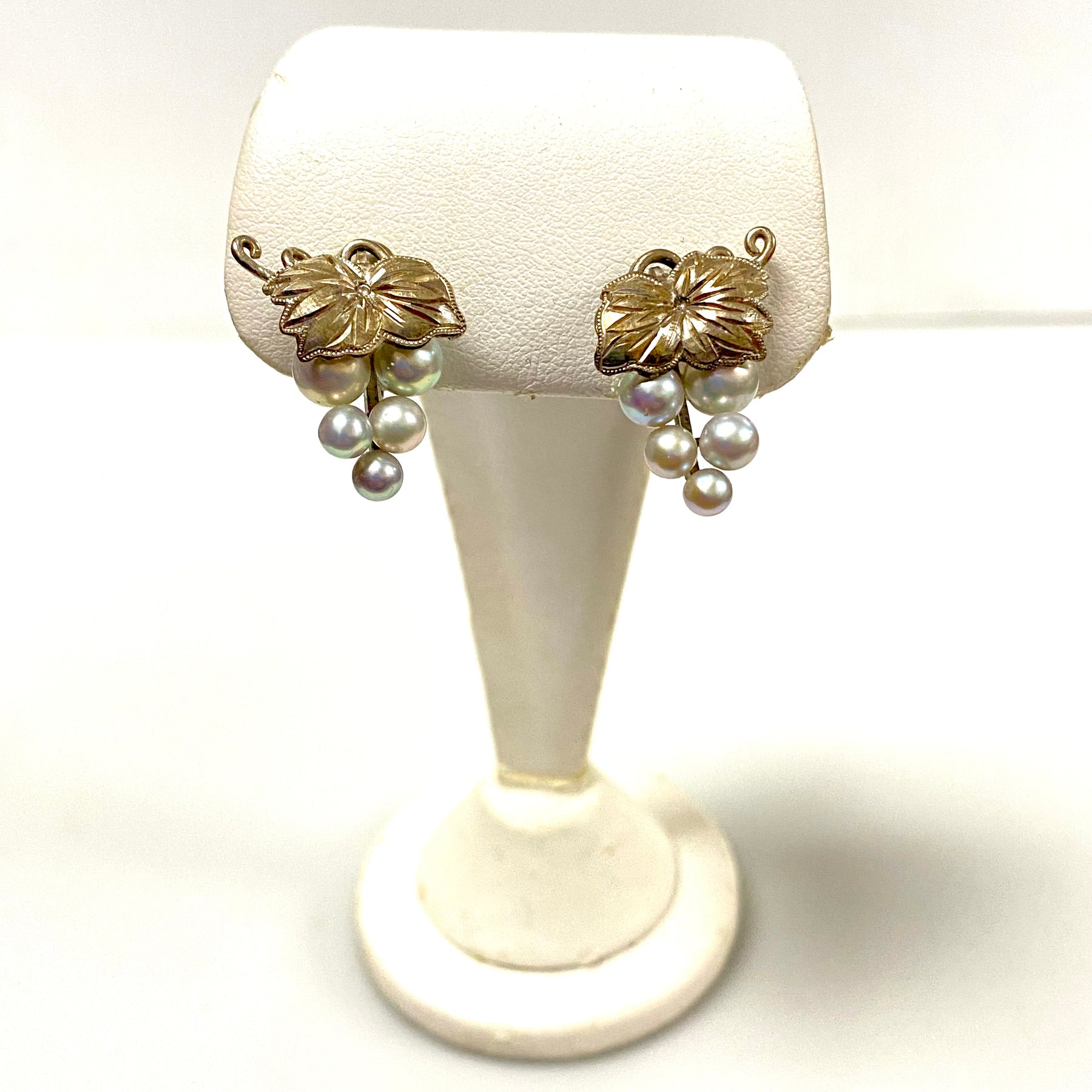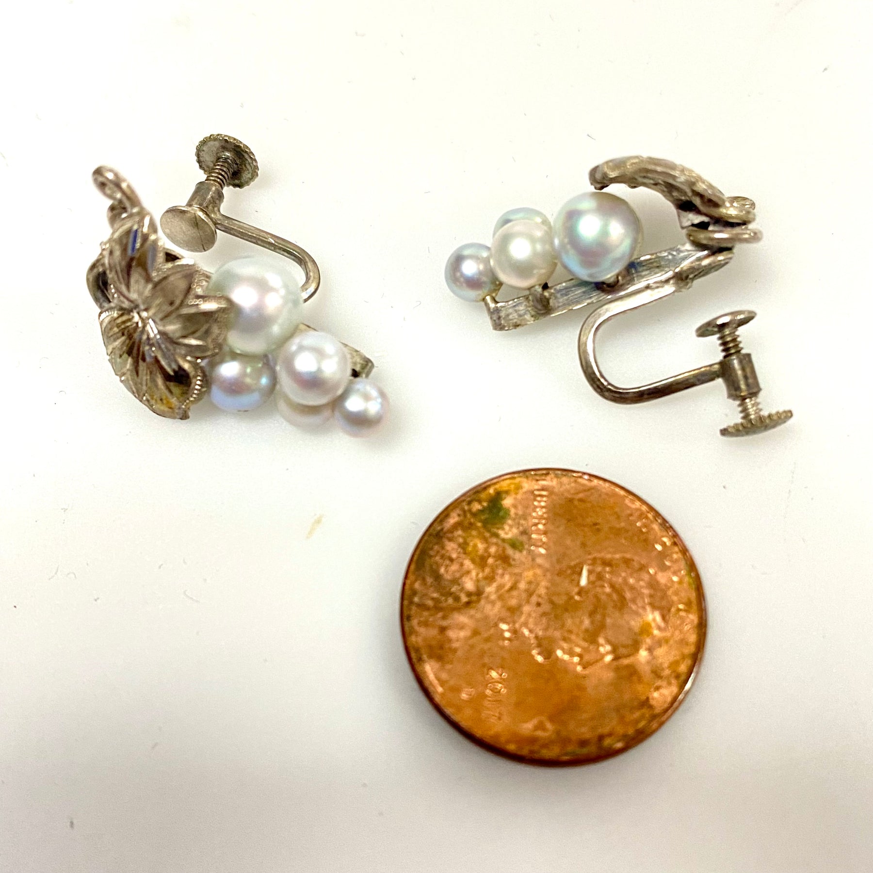 * Each earring - approx. 20mm x 17mm. 5.9g. Screw back closure. 4-5mm in diameter graduated size pearls.