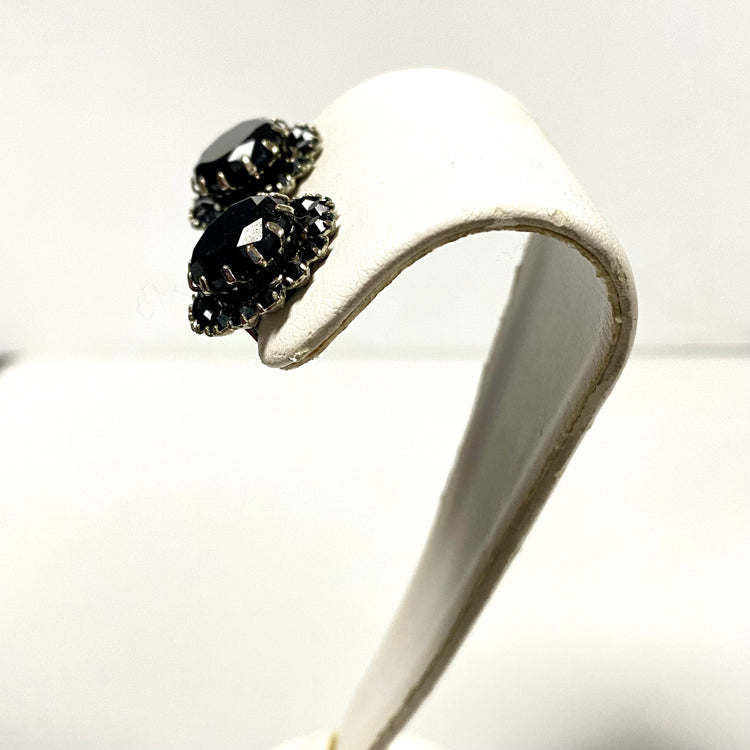 u856 Vintage 2pc Clip-on Earrings Set Silver Tone Black Stones Flower Shape