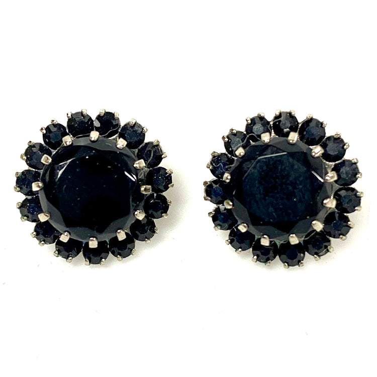 * Vintage 2pc Jewelry Set - Earrings in a shape of flower. Center round black stone (11mm in diameter) surrounded with small black stones (2mm in diameter each)