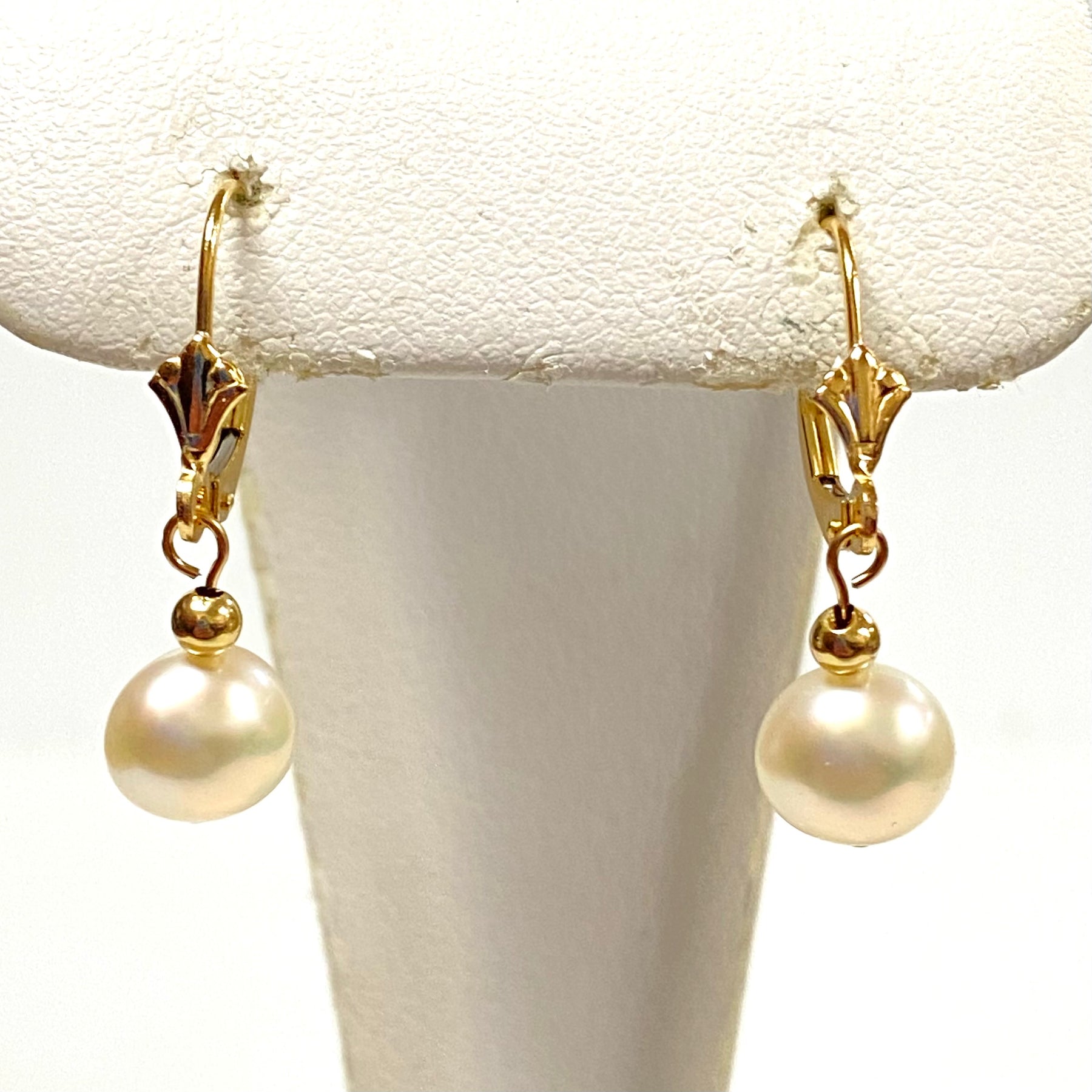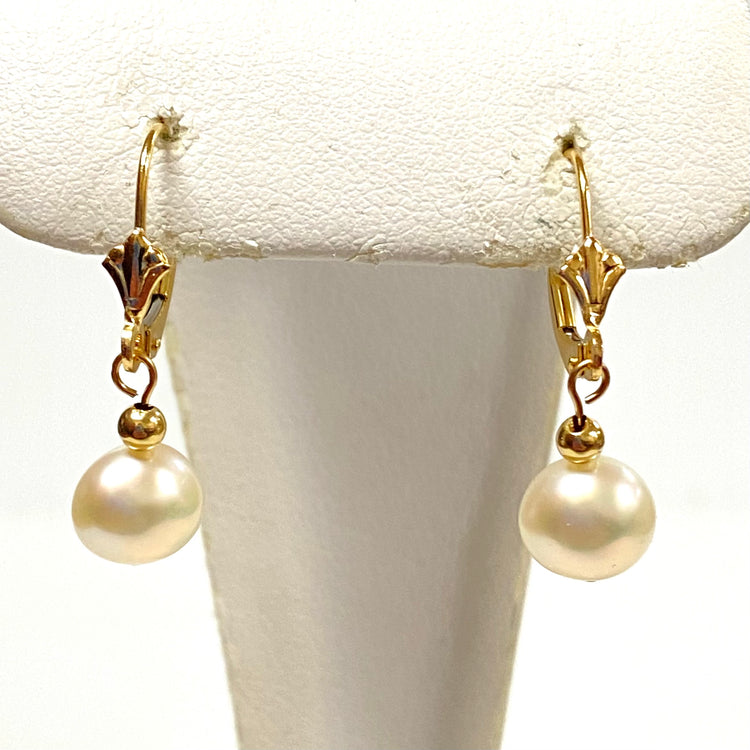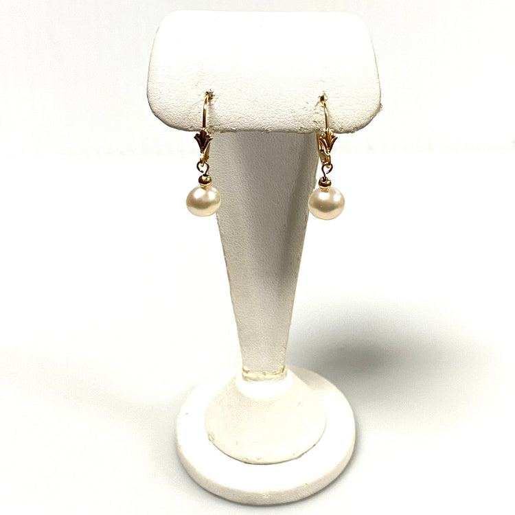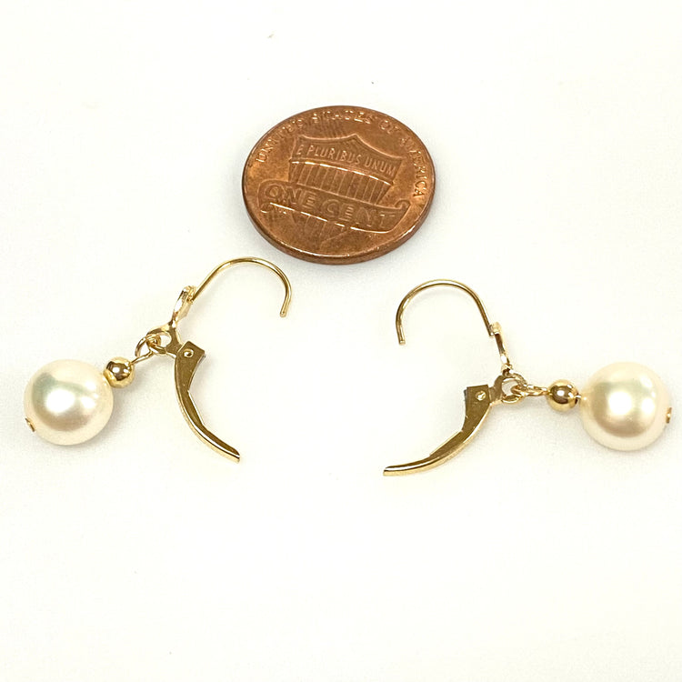 u915 Vintage Classic 14K Yellow Gold 8mm Pearl Bead Dangling Earrings