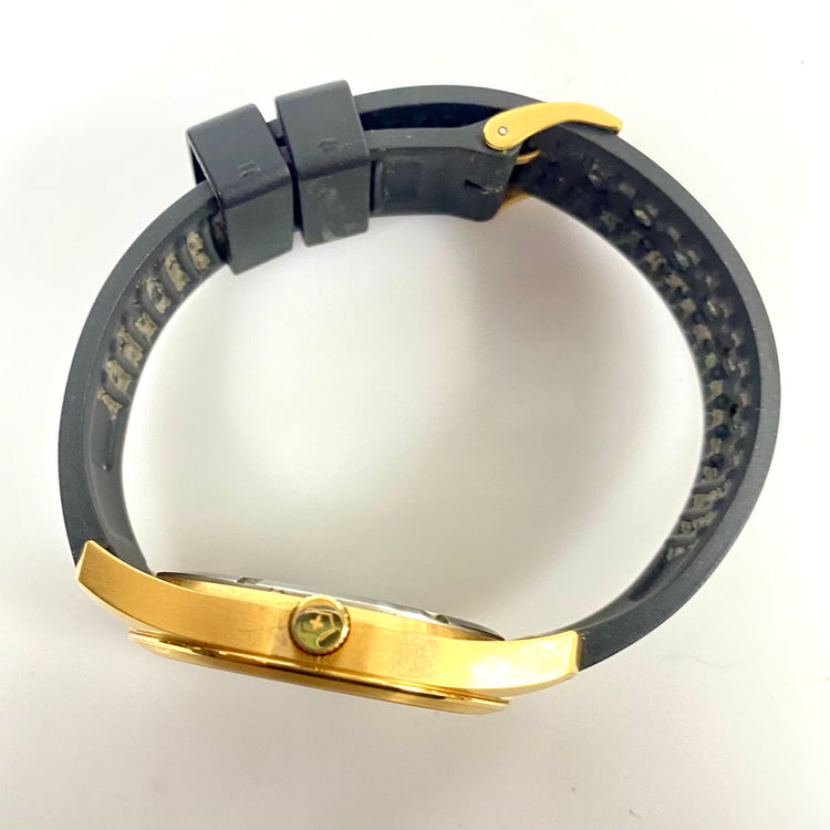 Stainless steel, silver and gold tone. Silicone Band, original with same logo.