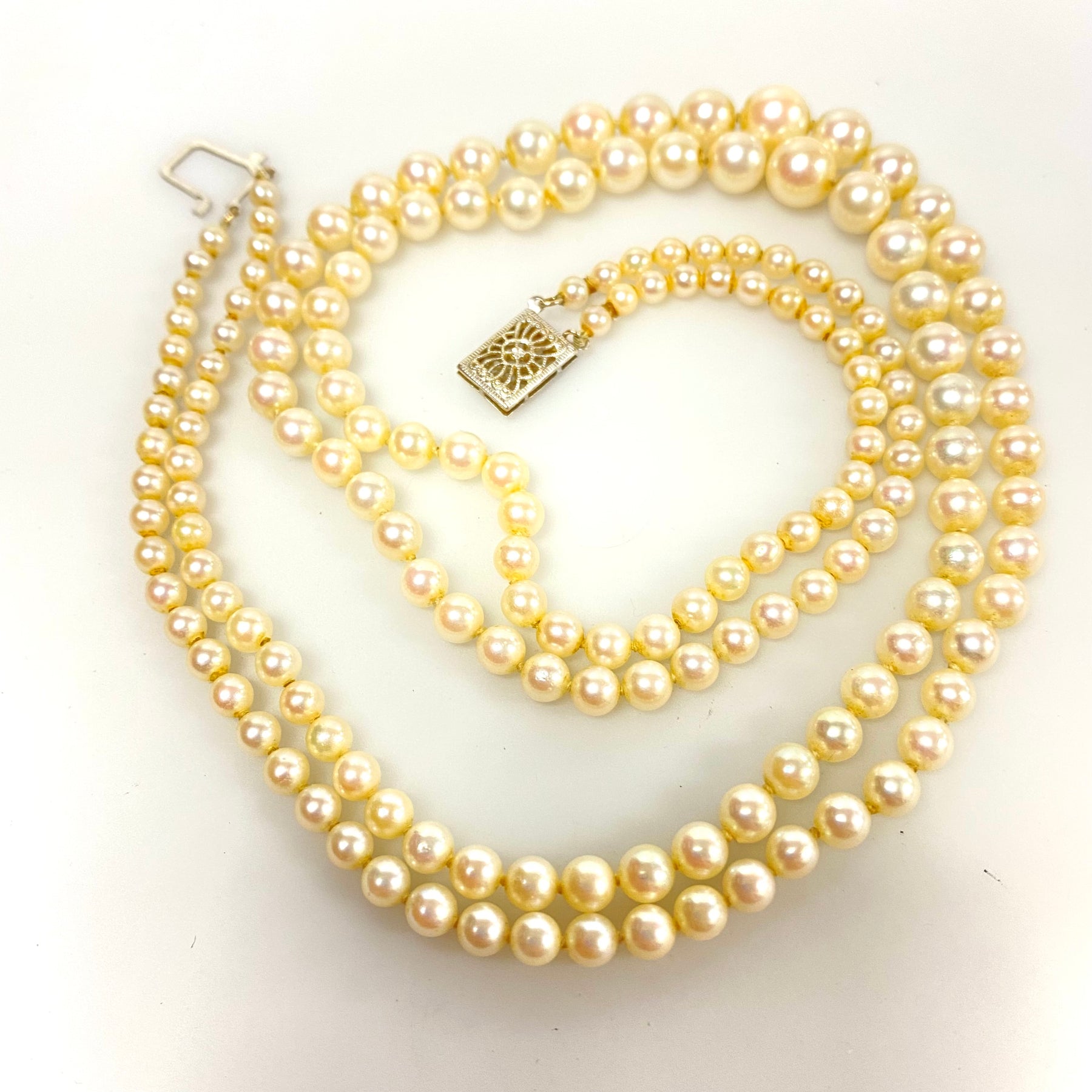 * Natural White Pearl Beaded necklace. Beads are approx. 3mm to 7mm in diameter. Necklace is composed of 2 strings 16" long and 17" long. 14K White Gold Filigree Lock(stamped), white gold tone.
