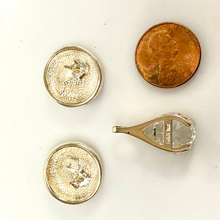 * Vintage sterling silver 925 (stamped) Round Earrings and Sterling Silver(stamped) pendant. Each Earrings is 19mm in diameter, pendant measures 24mm x 12mm with Clear oval stone 12mm x 10mm. Coin shown for size reference only.