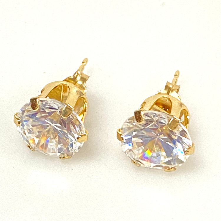 • Vintage 14k Yellow Gold stud earrings. White/colorless Cubic Zirconia stones 8mm in diameter each.