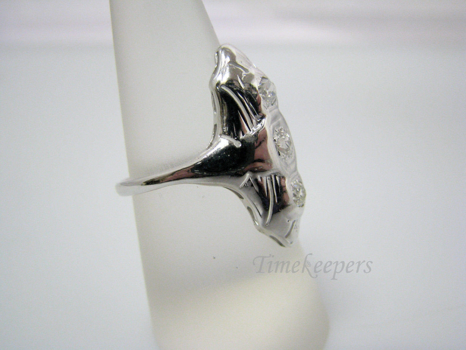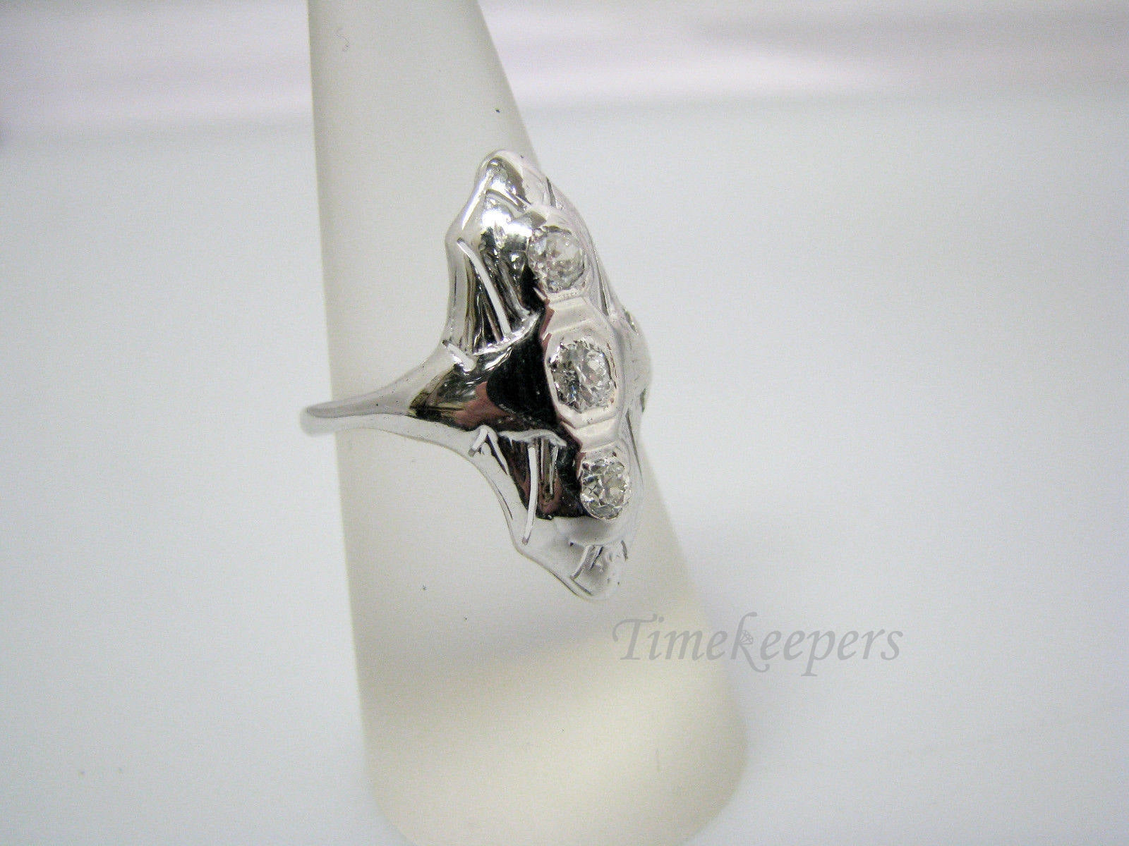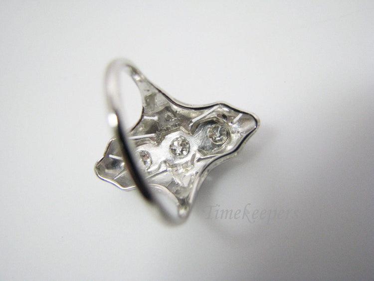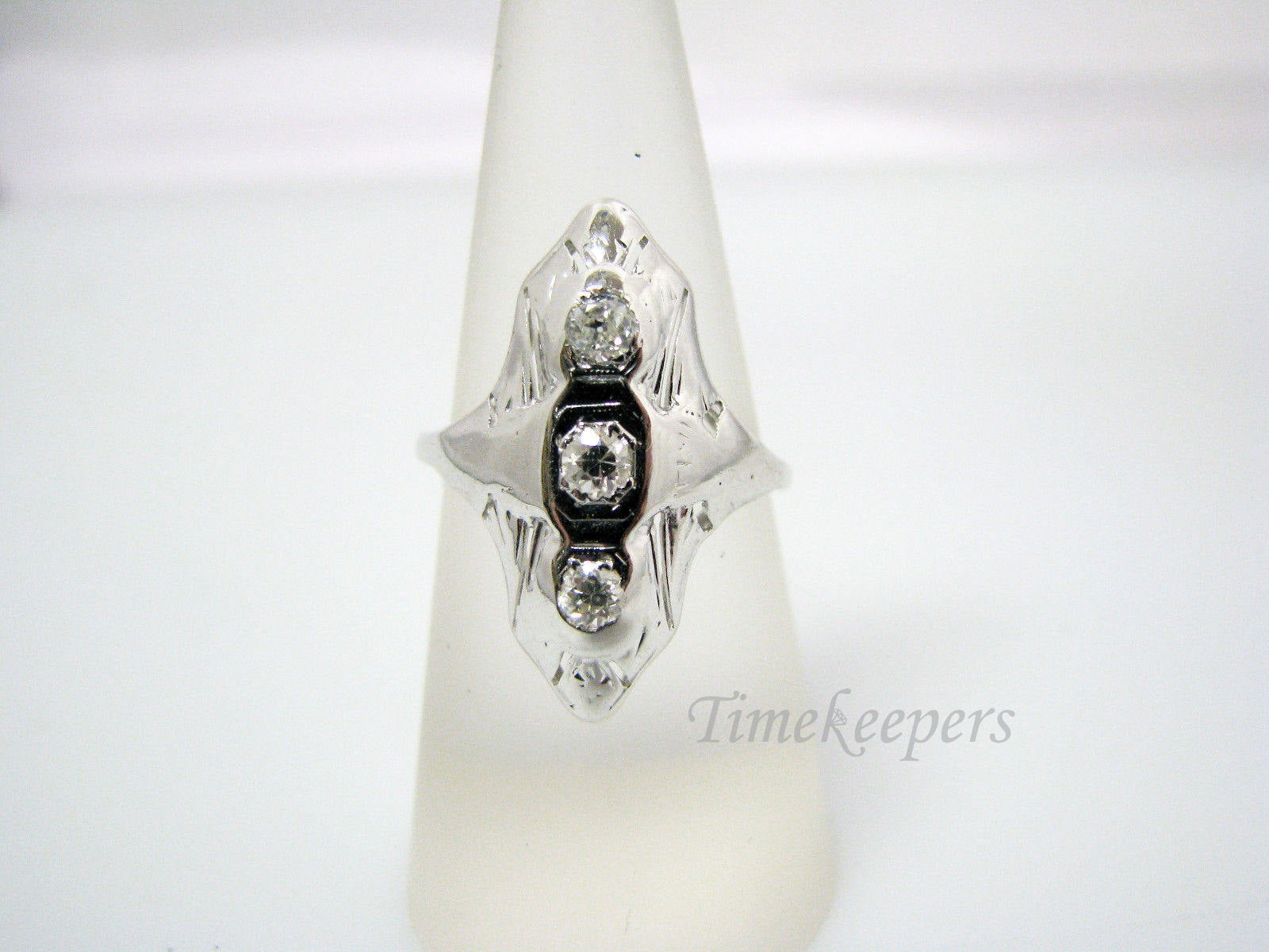 This handsome ring features approx. .35 tcw diamonds set in a long 14k white gold ring. This ring is not marked but has been tested to 14k gold. This would be a different take on the (3) diamond ring!
