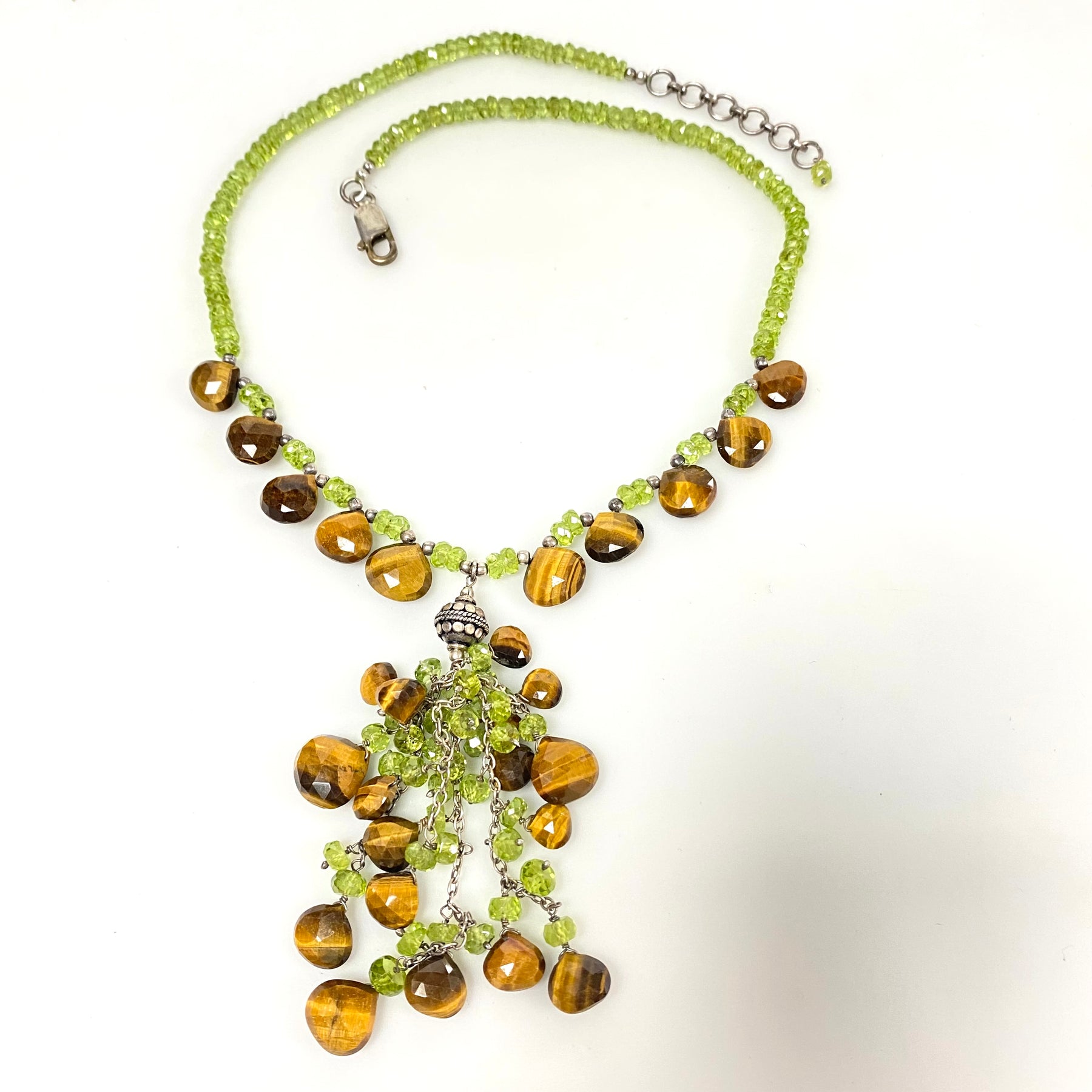 * Vintage Mixed Size Peridot Yellow Tigers Eye Necklace. 925 Sterling Silver. Total Length (Including beaded and ties) 20" long.