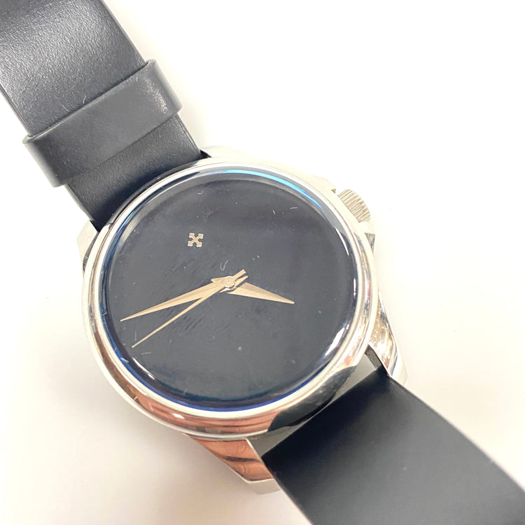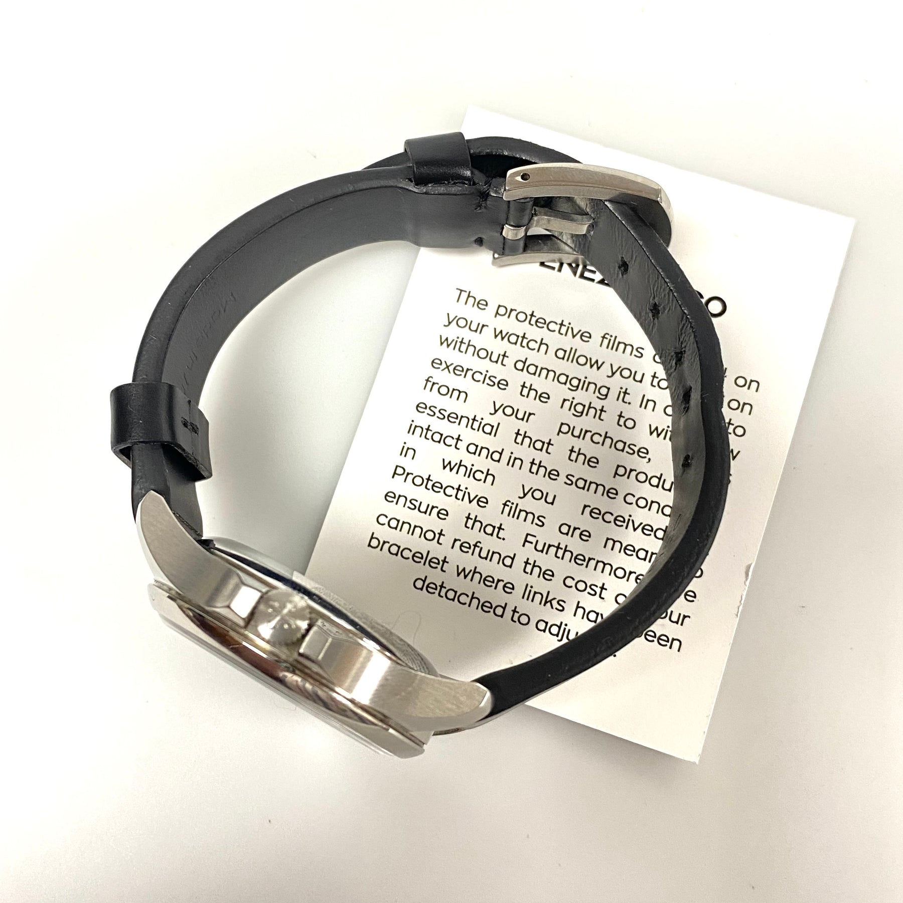 Silver Tone. Stainless steel, original black leather band. Sapphire Glass.