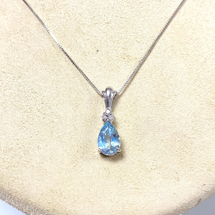 * Teardrop shaped Pendant. Tested 10K. 9mm x 6mm Blue Aquamarine and three 3) round Diamonds tw 0.03cts.