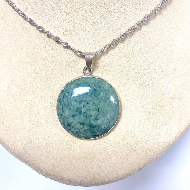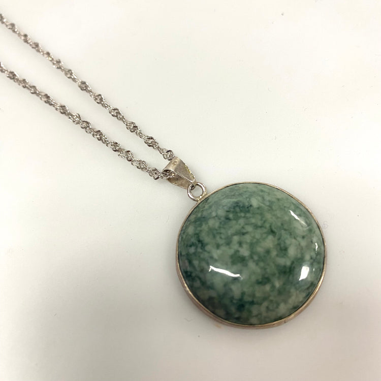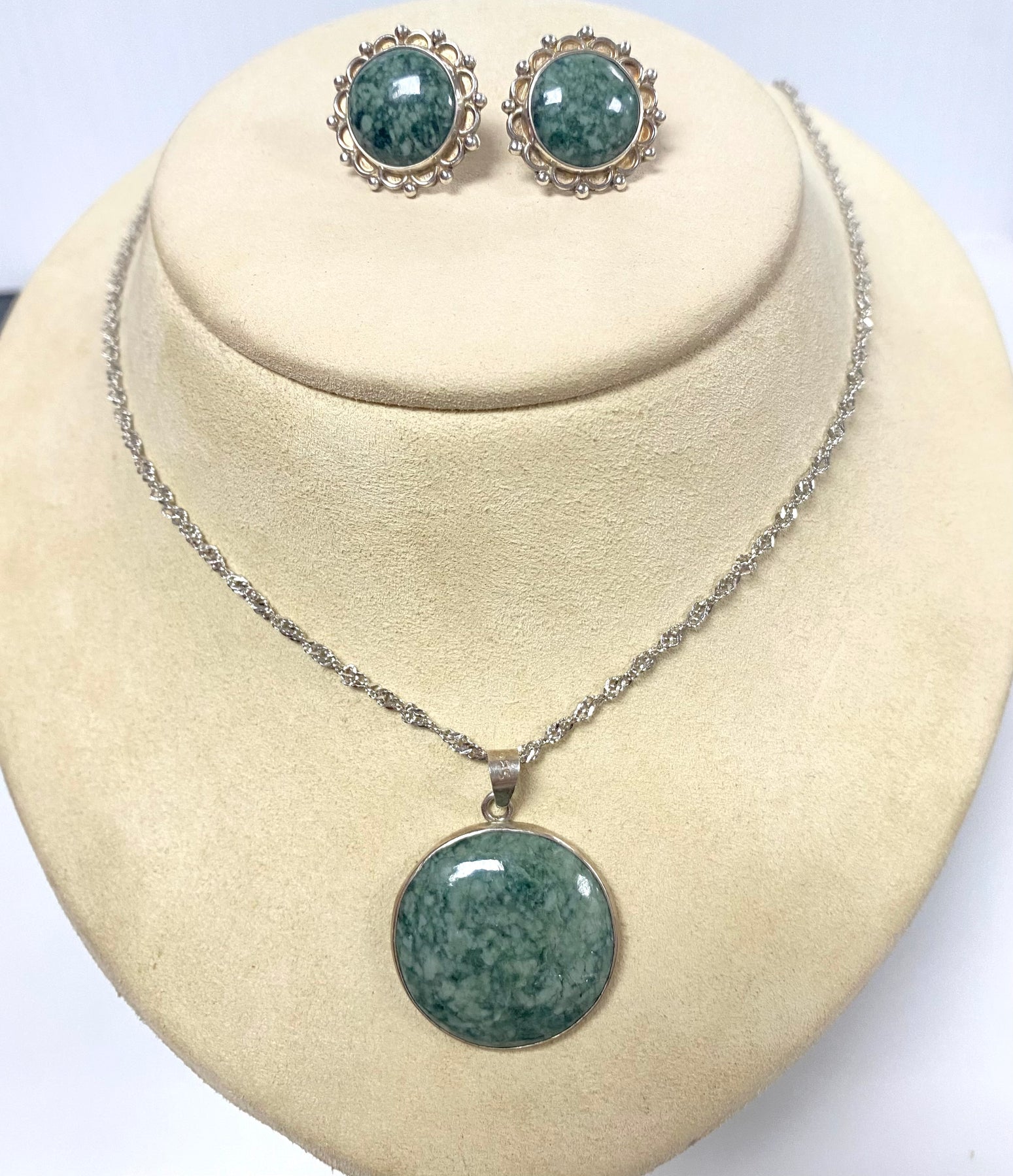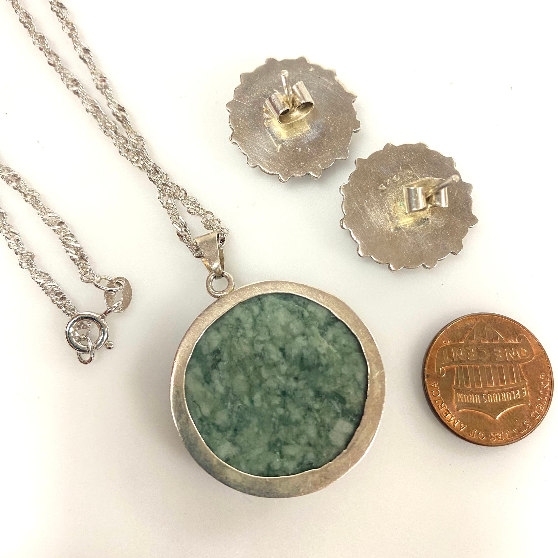 v204 Vintage Sterling Silver 925 Green Jade Earrings Pendant 19" Necklace Set