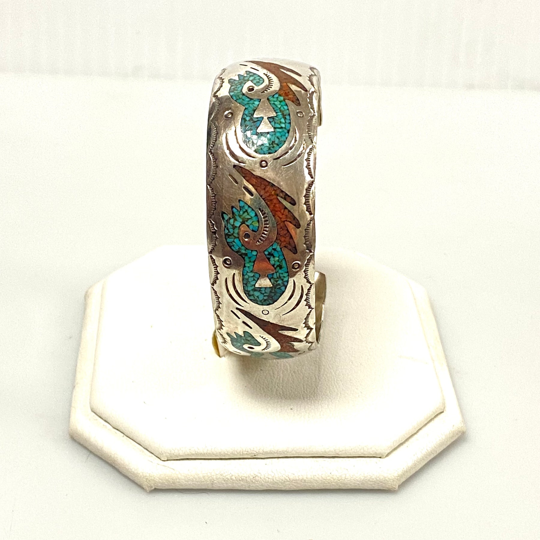 v252 Vintage Navajo Native American Sterling Silver 20mm Cuff Chip Inlay Bracelet