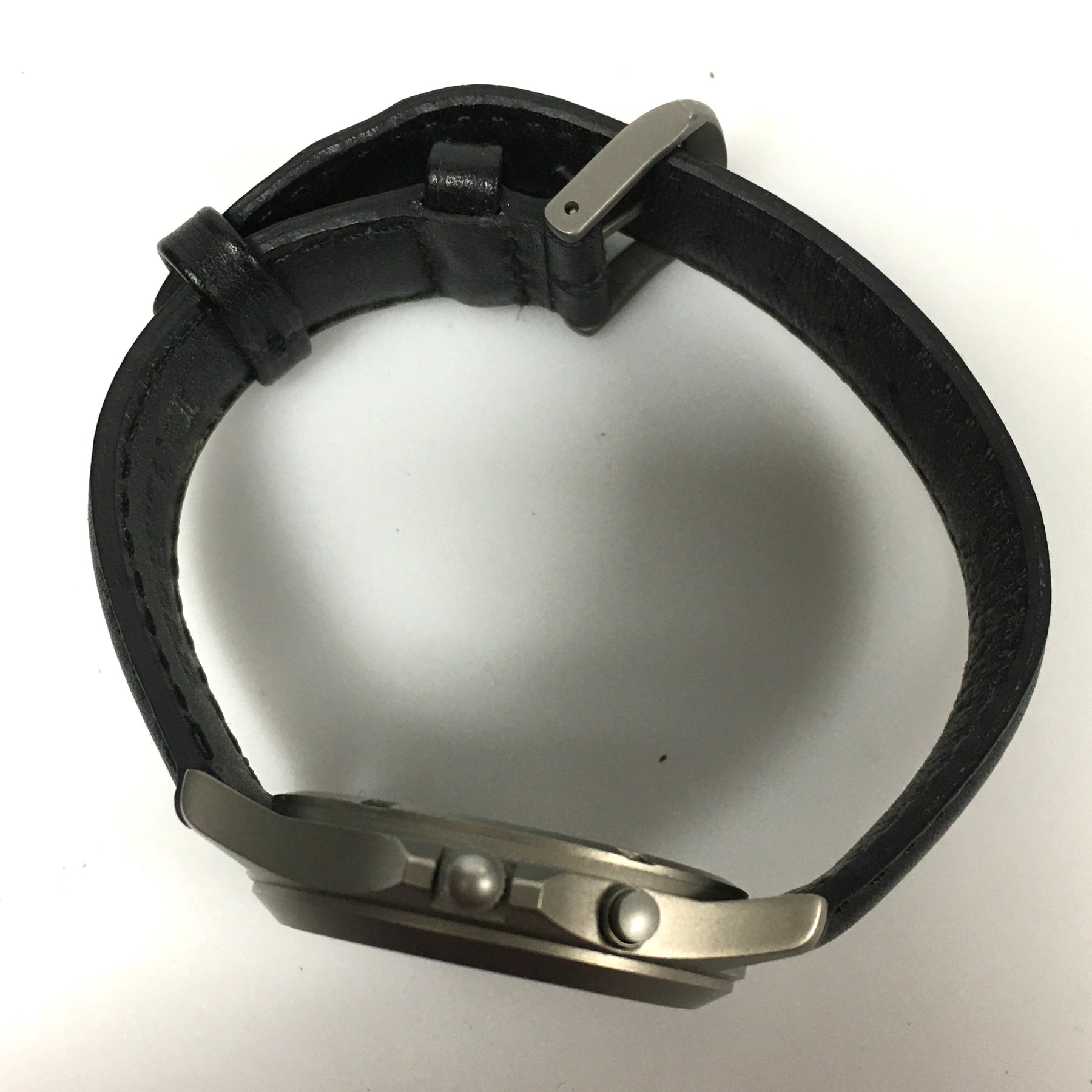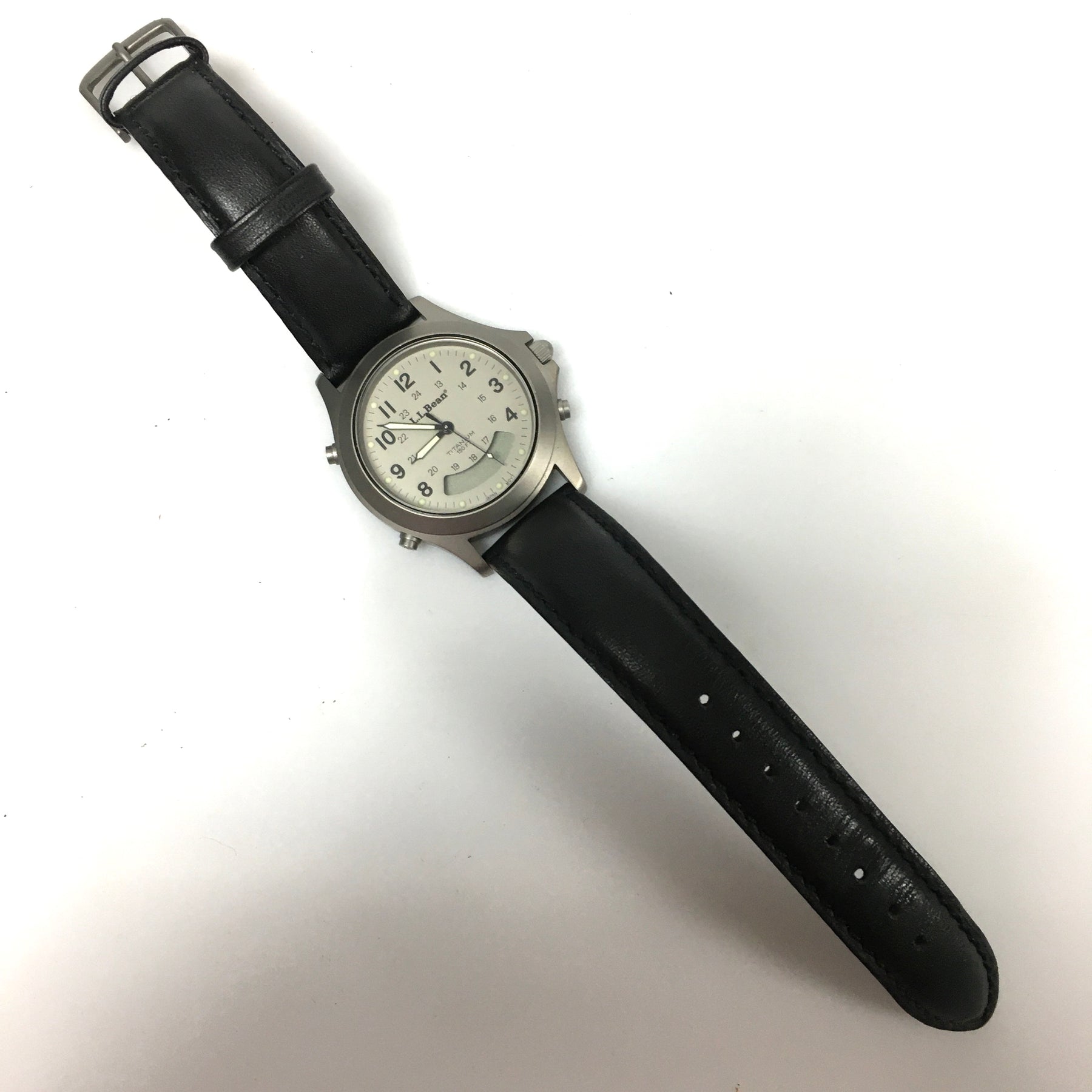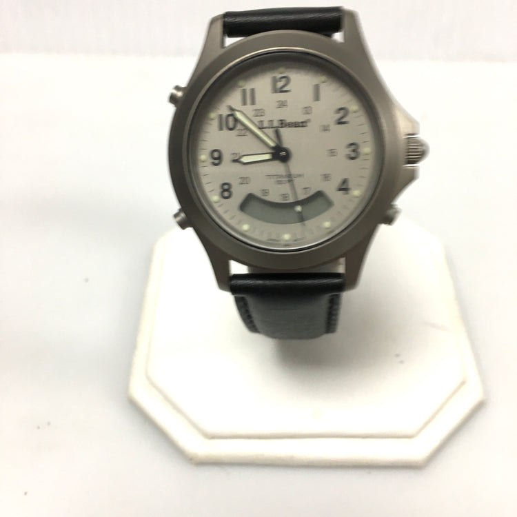 L.L.Bean Wrist Watch. Silver Tone metal, titanium case. Black Leather Band.