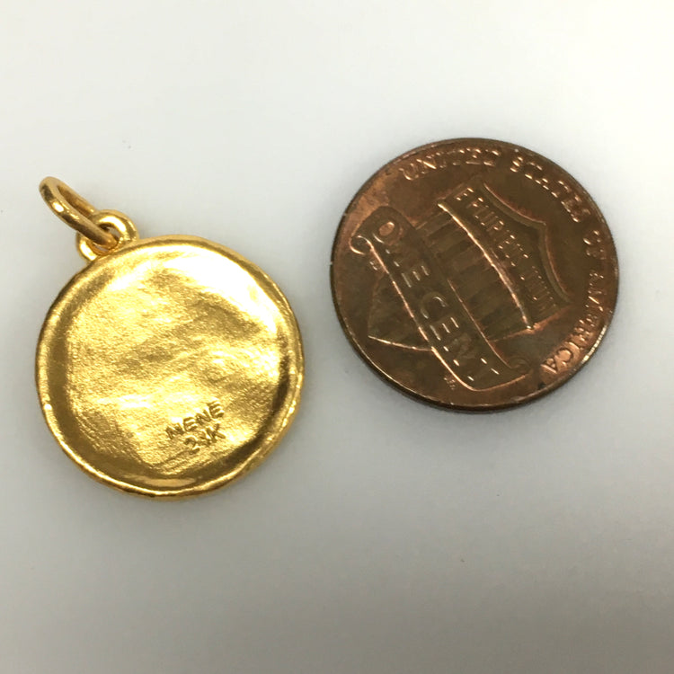 Vintage 24k Yellow Gold Saint Christopher Charm Pendant. Round, stamped MENE 24k.