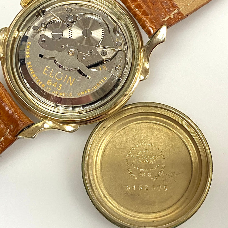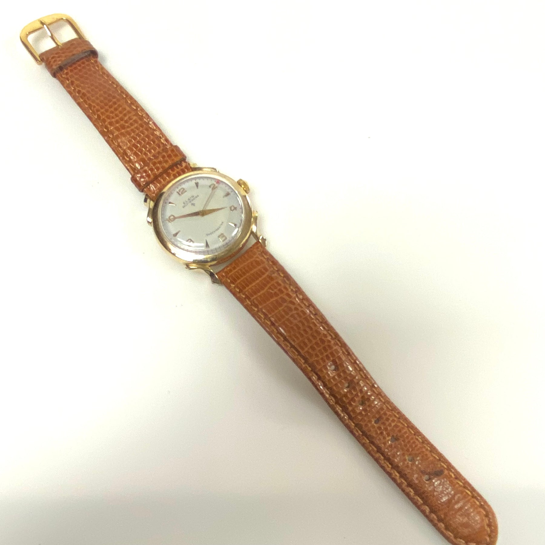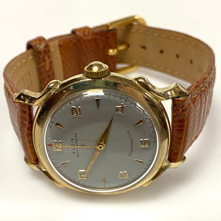 - This is a vintage 1950s Elgin Self-winding Shockmaster men's automatic wristwatch with a gold-filled case and a brown leather strap.
