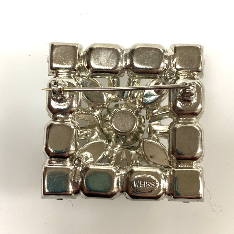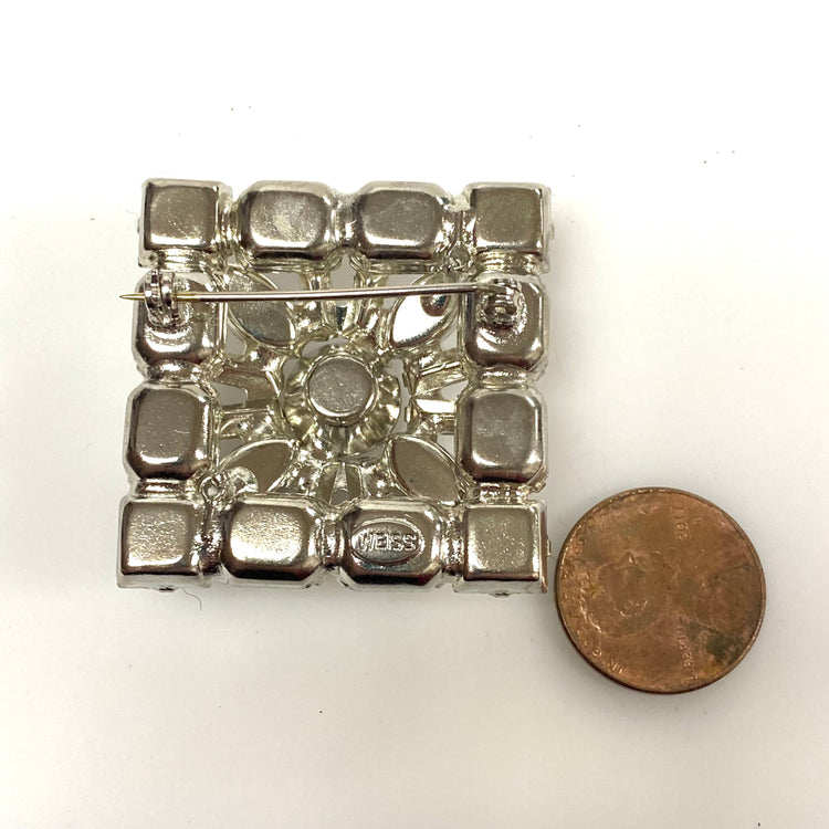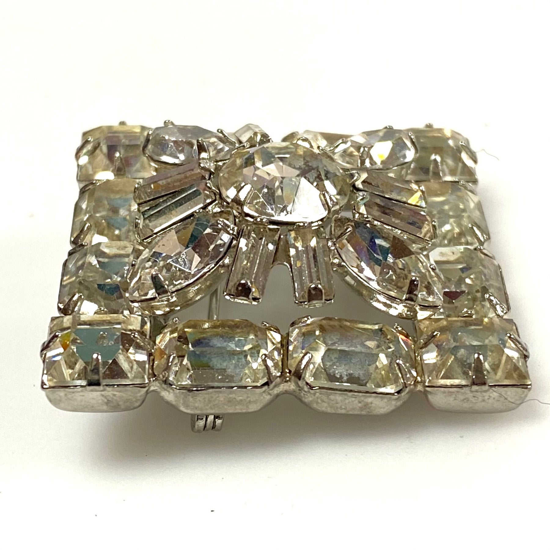 v494 Vintage Weiss Crystal Clear 3-layer Rhinestone Square Brooch Pin