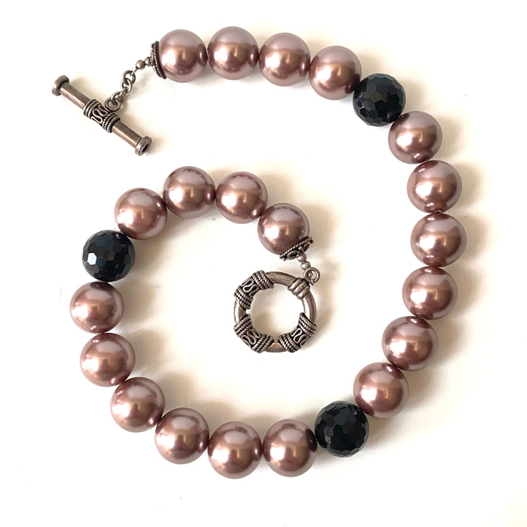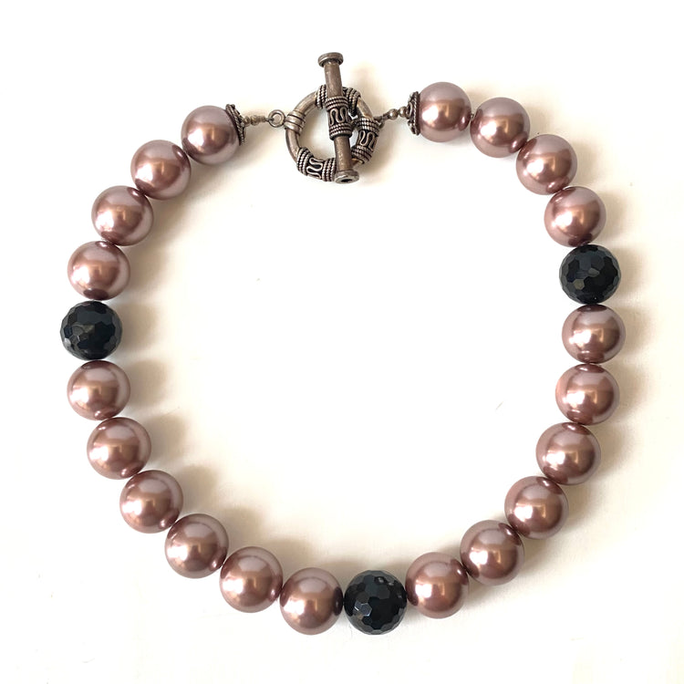 v513 Vintage Mauve Faux Pearl & Black Bead Boho Toggle Closure Necklace 17" Long
