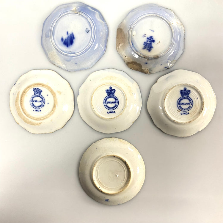 - Lot of 6 antique Flow Blue butter pats or small butter dishes/plates, which are a popular collectible item.