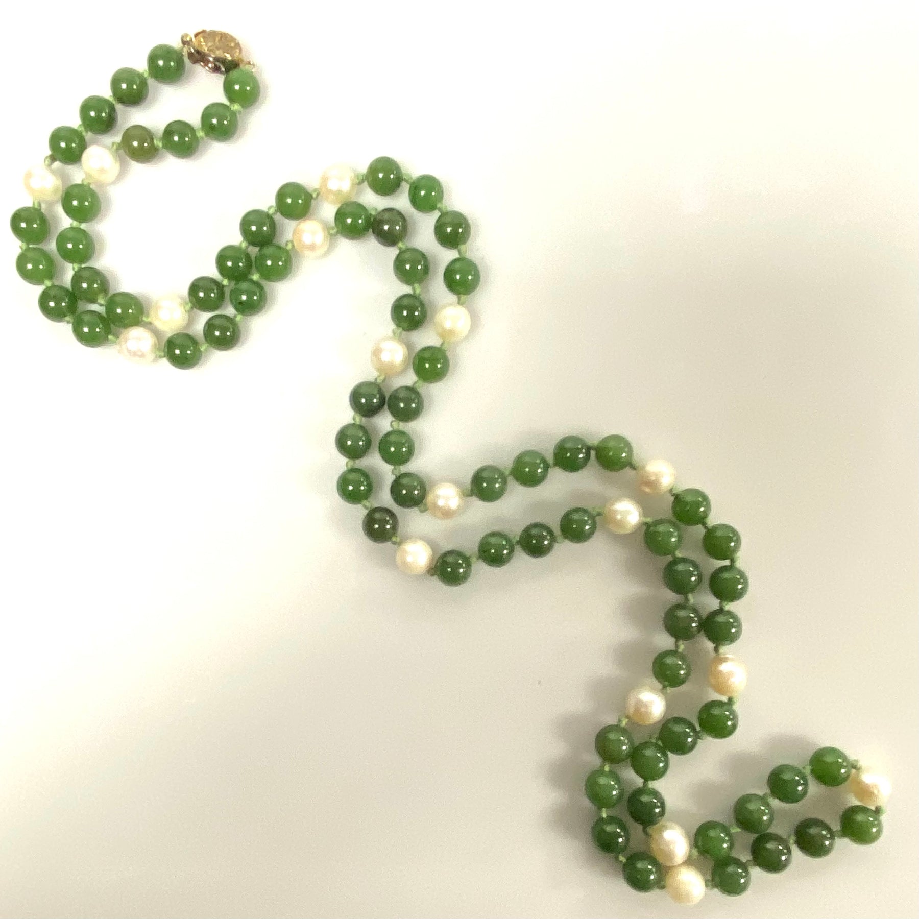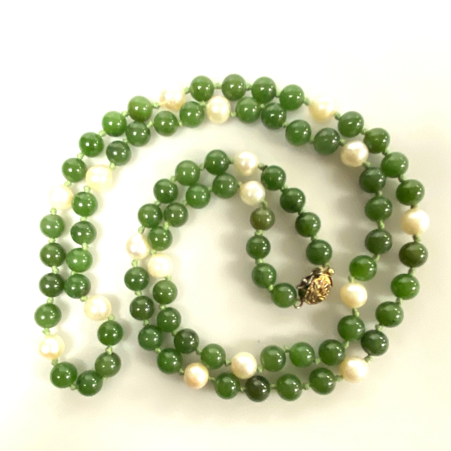 * Vintage Jade and Pearl Beaded Necklace. Round Beads, 7mm in diameter each.