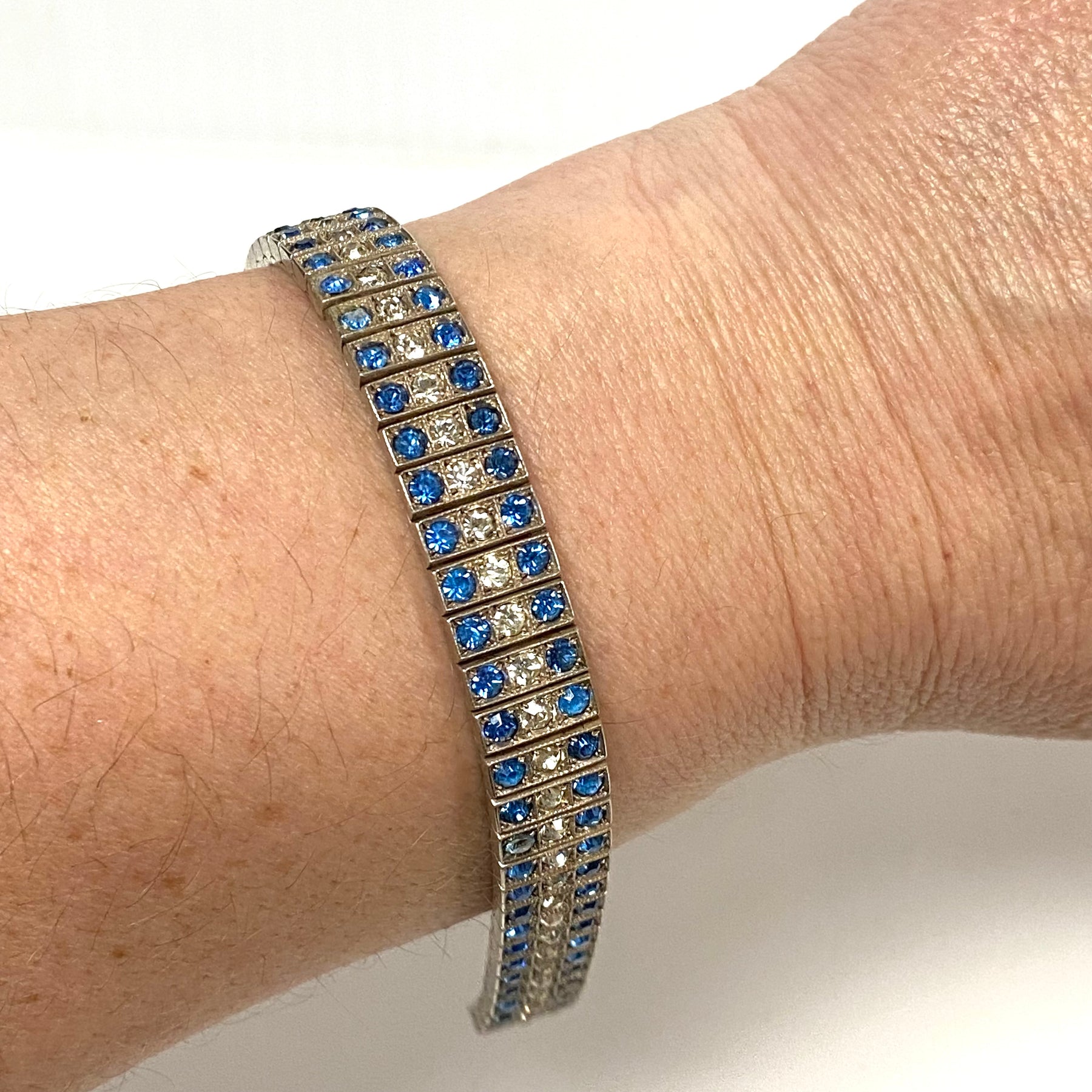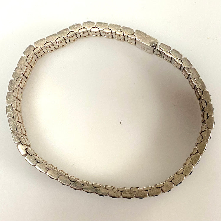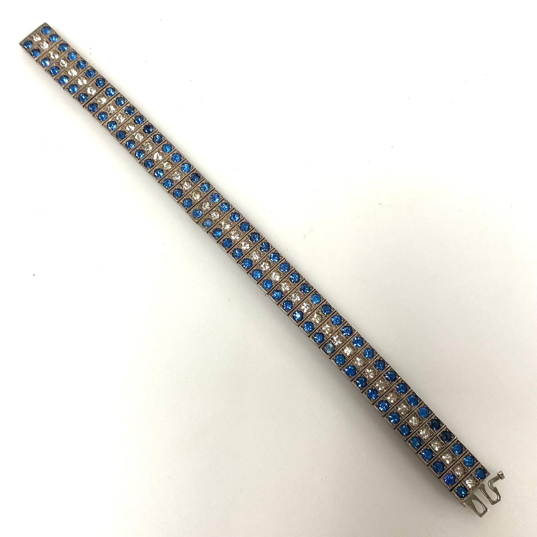 v541 Vintage Art Deco Diamondbar Sterling Silver White Blue Rhinestone Bracelet