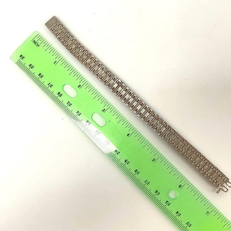 * Vintage Sterling Silver Bracelet (stamped sterling patent 32017 diamonbar). 7.75" Long, 10mm wide, 3mm thick.
