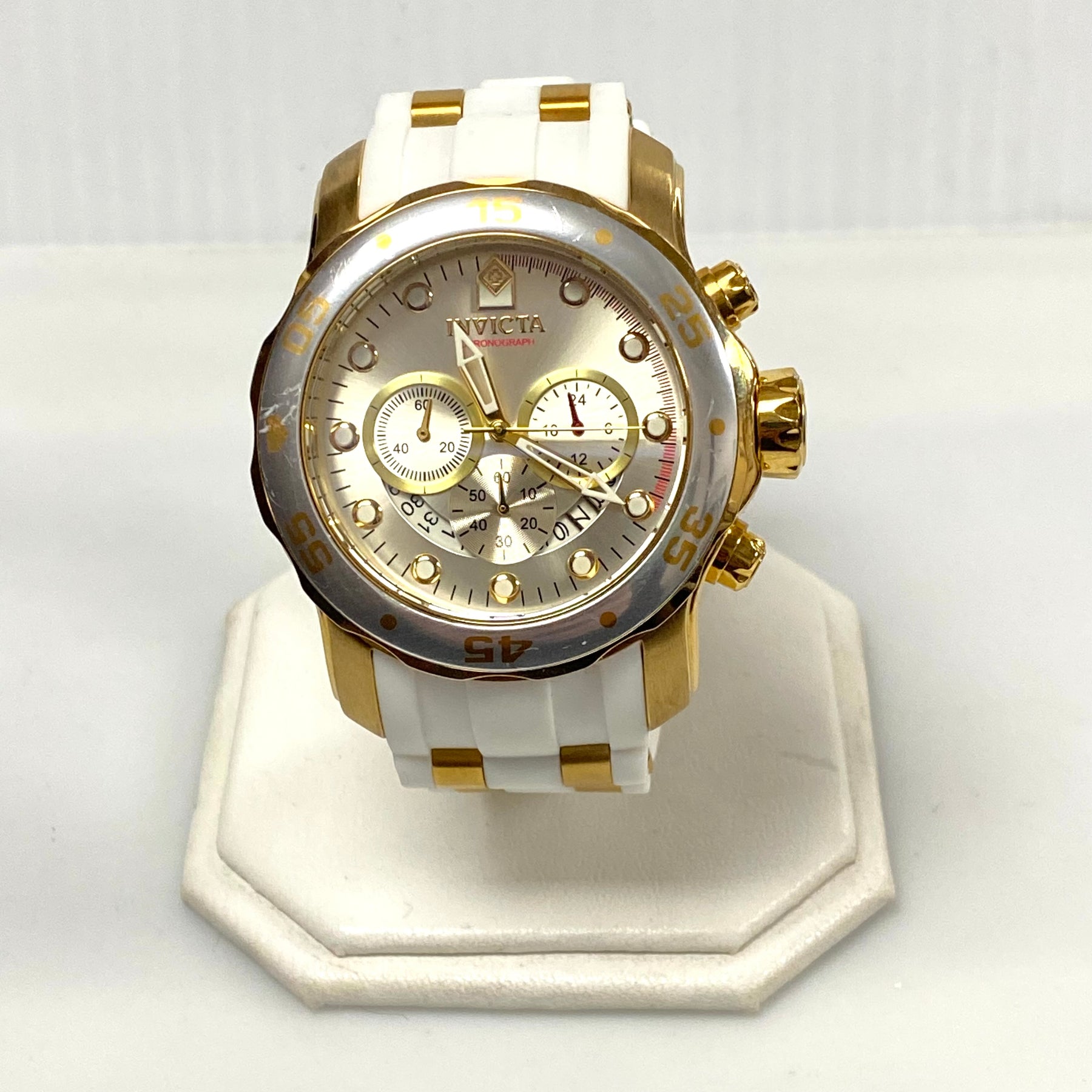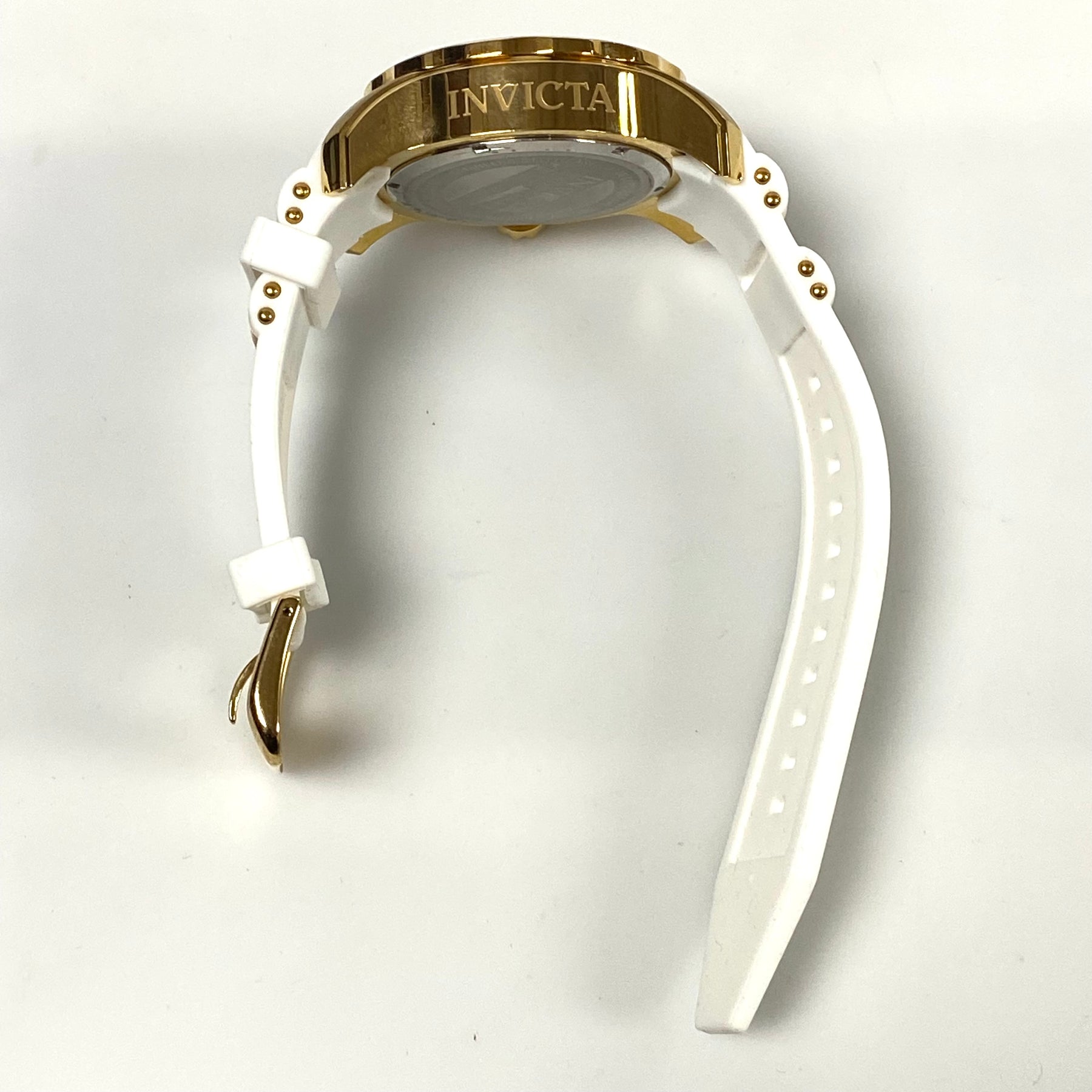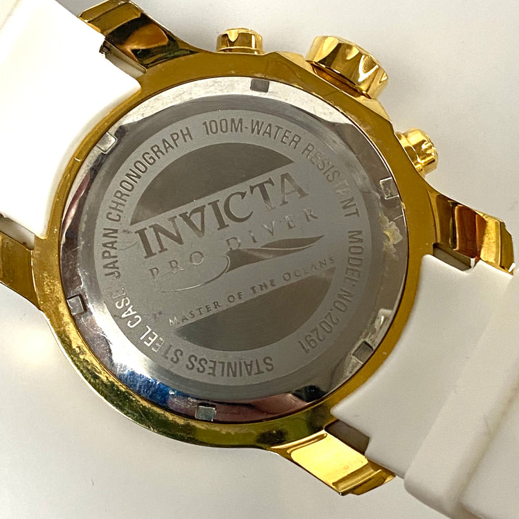The watch is the Invicta Men's Pro Diver model 20291. It features a gold-tone stainless steel case and a white silicone strap with gold-tone inserts.