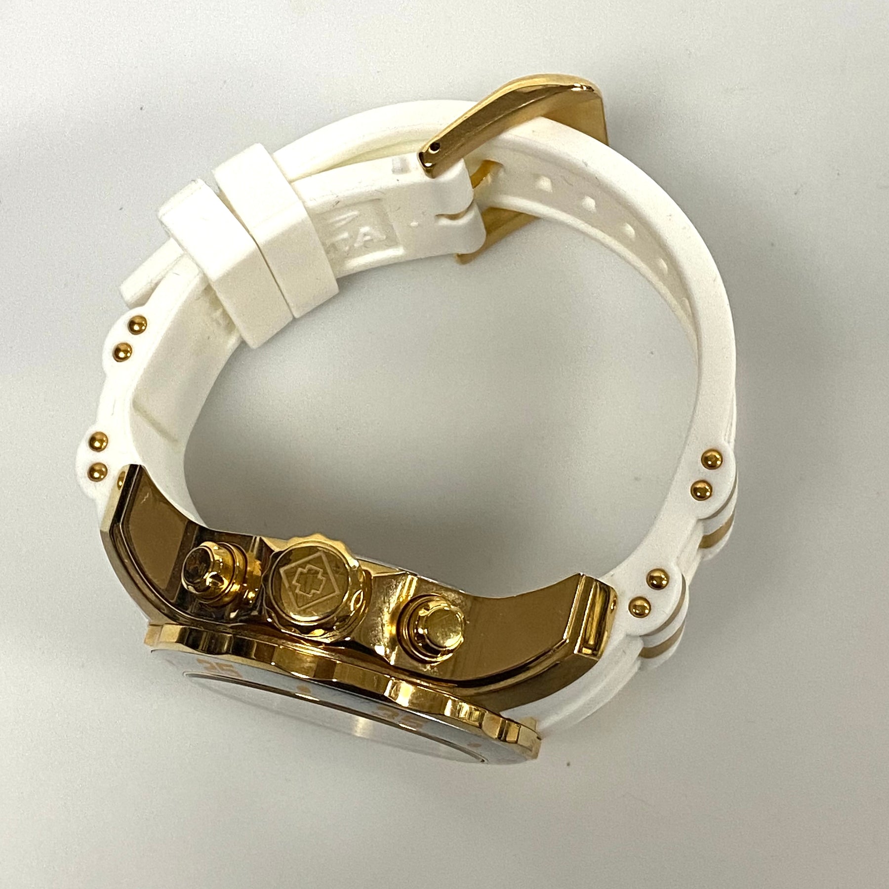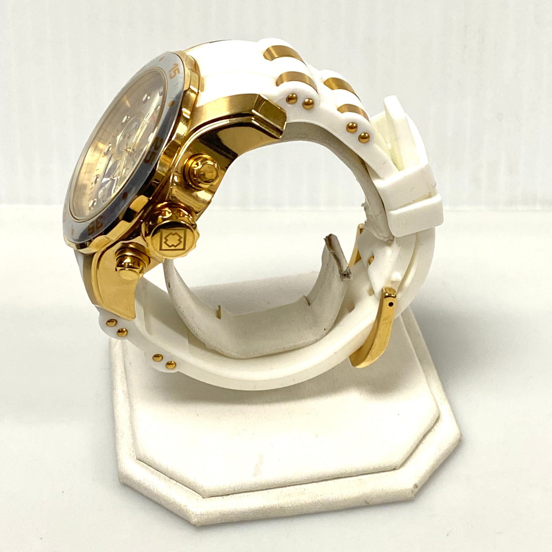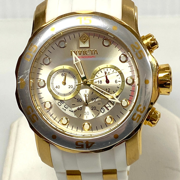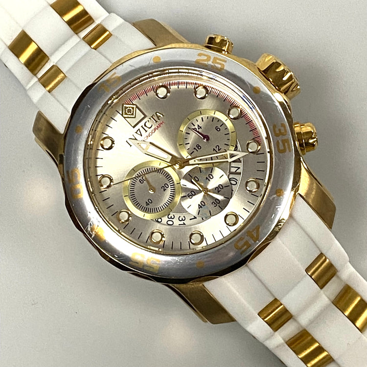 The watch is the Invicta Men's Pro Diver model 20291. It features a gold-tone stainless steel case and a white silicone strap with gold-tone inserts.