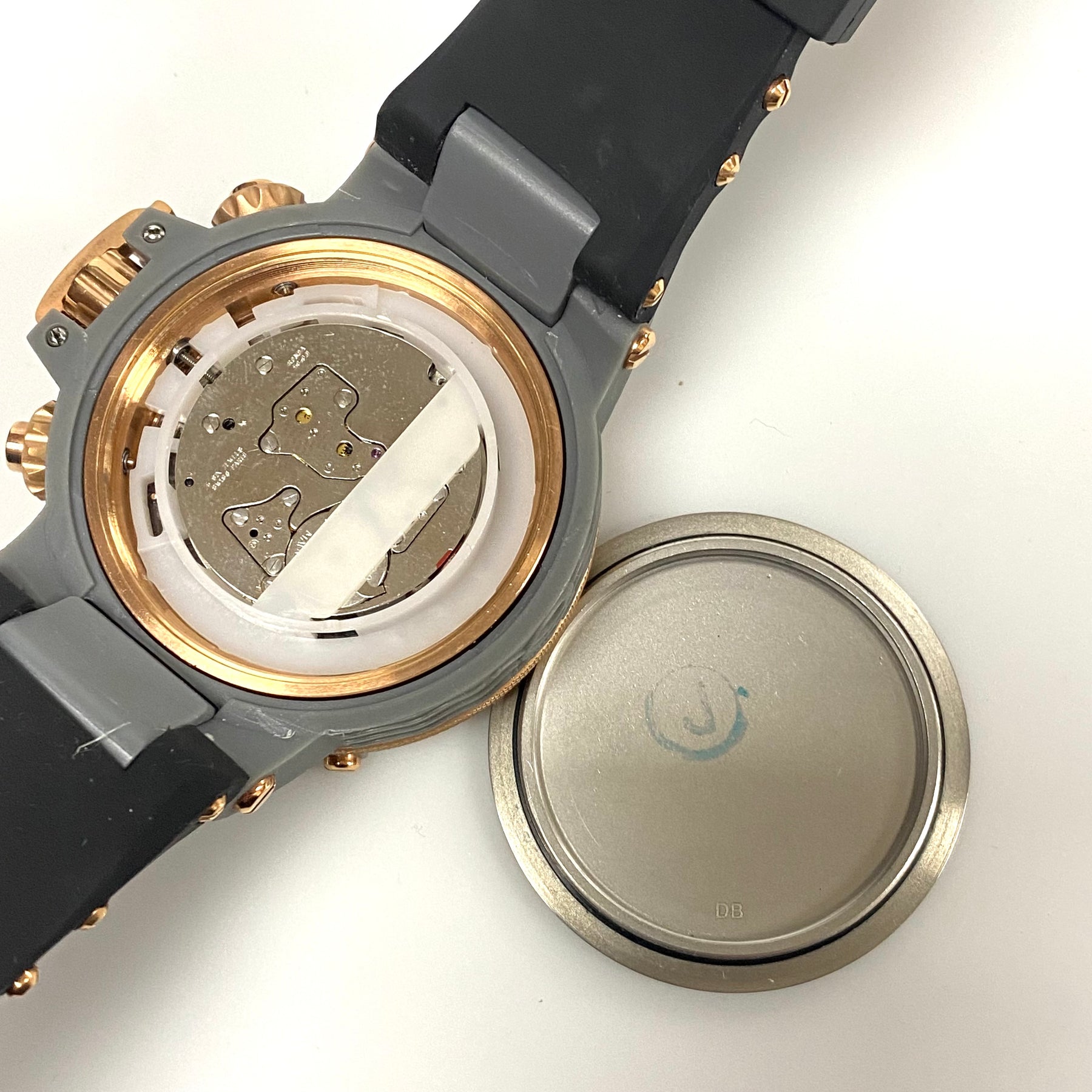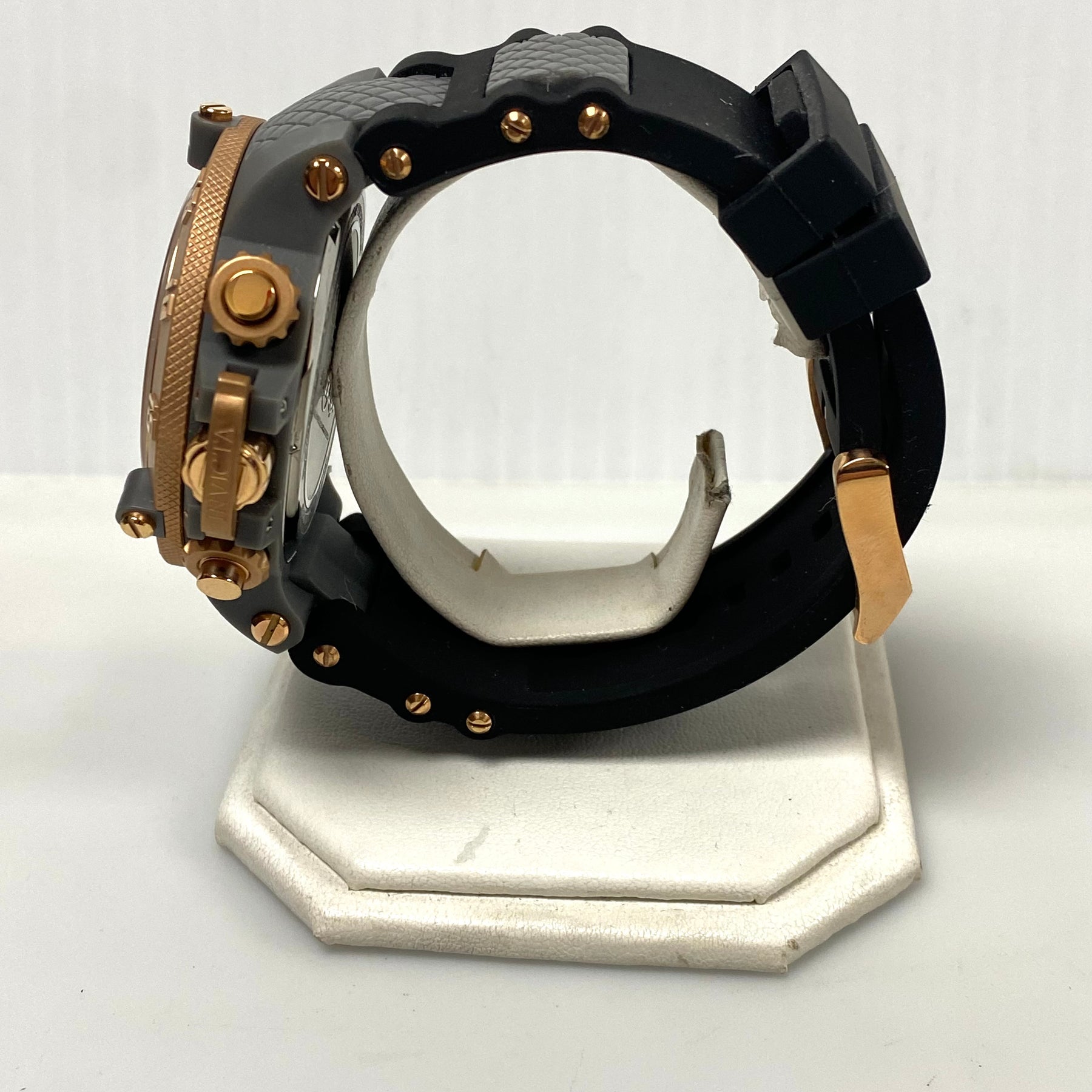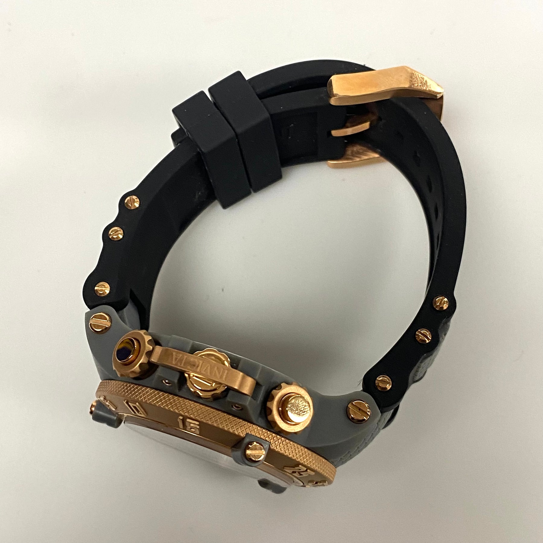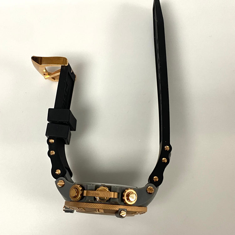 - Case: The watch has a large 50mm case made of stainless steel and plastic, with a rose gold-tone and grey unidirectional rotating bezel.